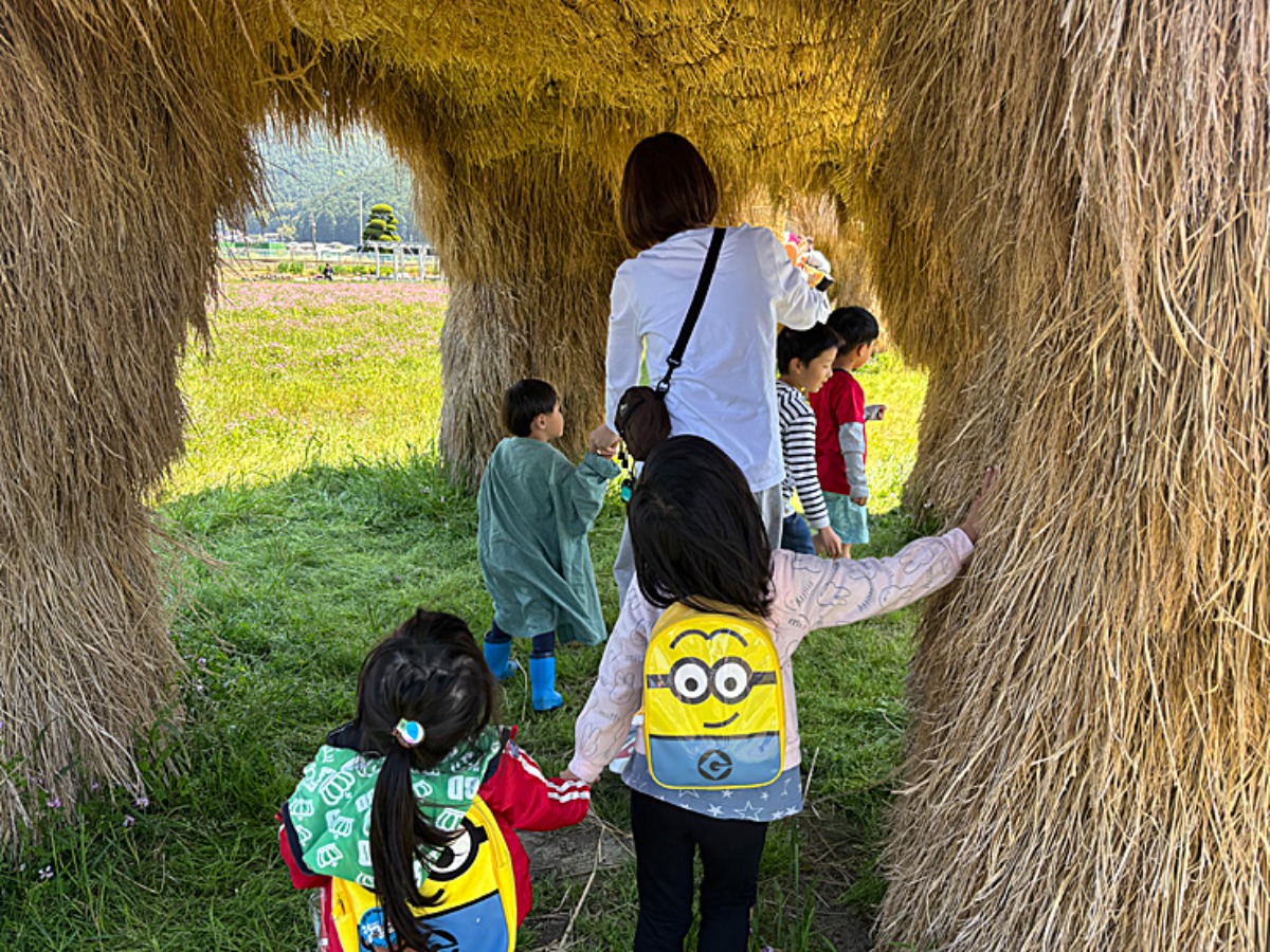田んぼの中に入ったり、わらマンモスに近づいてみたり、タケノコにふれてみたりと刺激がたくさん。歩き疲れたら、水路脇に腰かけてちょっと一息。
