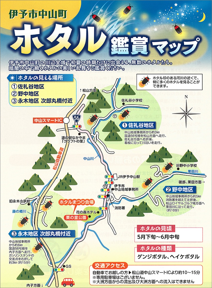 現在、伊予市中山町では、自生のホタルのみで鑑賞を楽しむことができます。