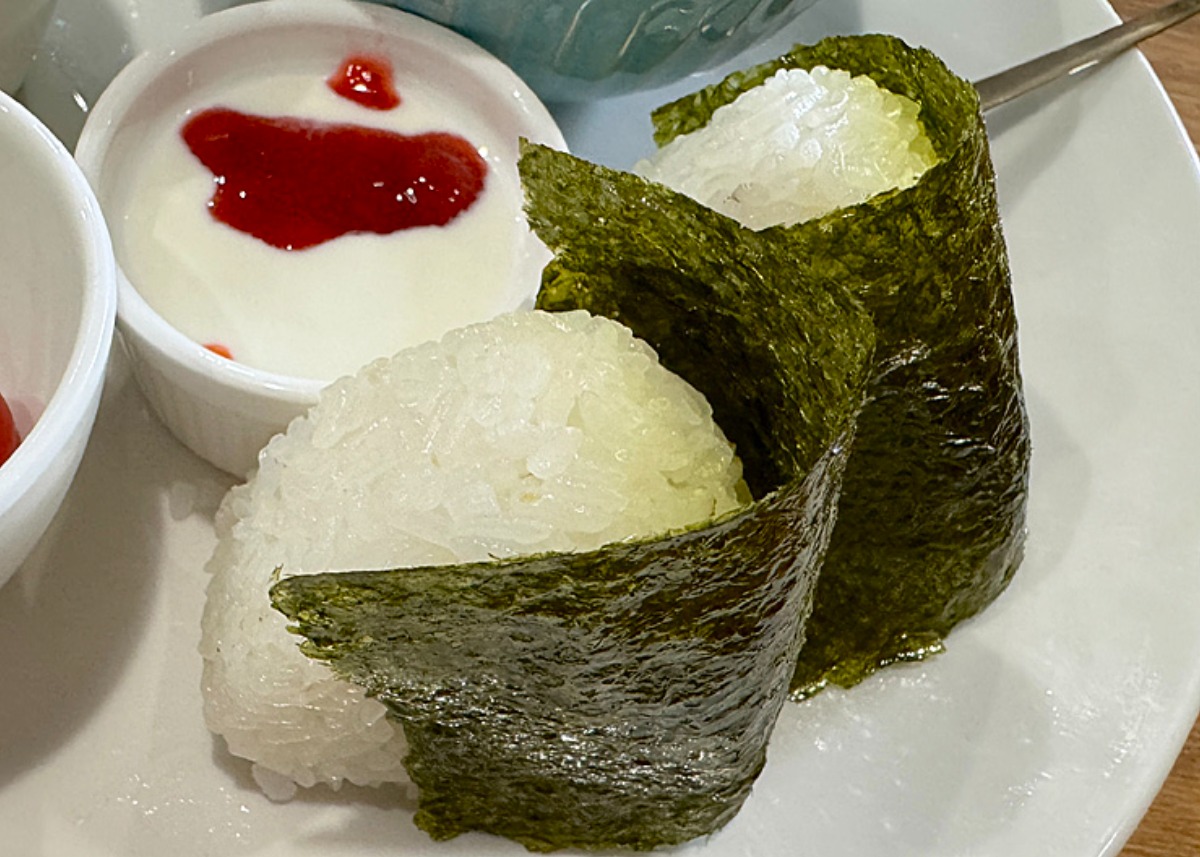 和食セットの主食はおにぎり!ふわっとやわらかく握られた塩にぎりに、大きめの味付け海苔がぐるり。ほんのり効いた塩気がちょうどよい一品です。