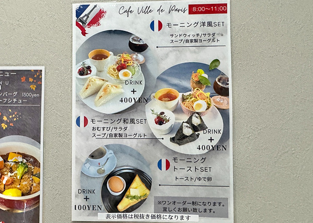 和洋セットは+税抜400円、トーストセットは+100円と、お好みに合わせてカスタマイズできます。