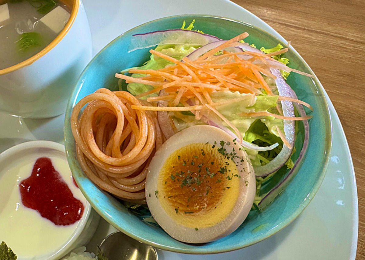 サラダに添えられているのは、よくあるゆで卵ではなく、しっかり味の染みた煮卵。
