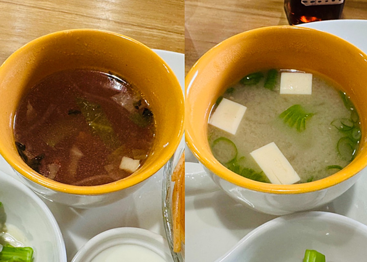 和洋で異なる汁物が登場。和食には、愛媛県民の食卓ではおなじみの「いよ味噌」を使った味噌汁が。一方、洋食にはタマネギの甘みと旨味がしっかりと溶け込んだ、香り高いコンソメスープが添えられていました。