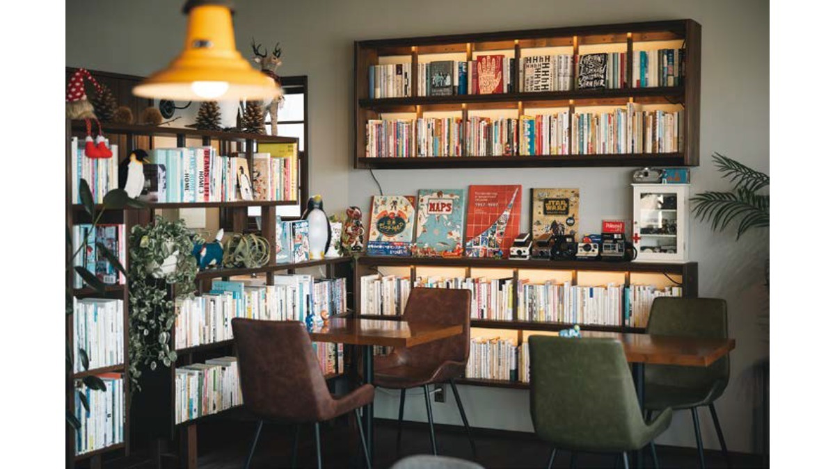 本好きの移住者夫婦が営むブックカフェで、店内の本棚には約1500冊の蔵書が。