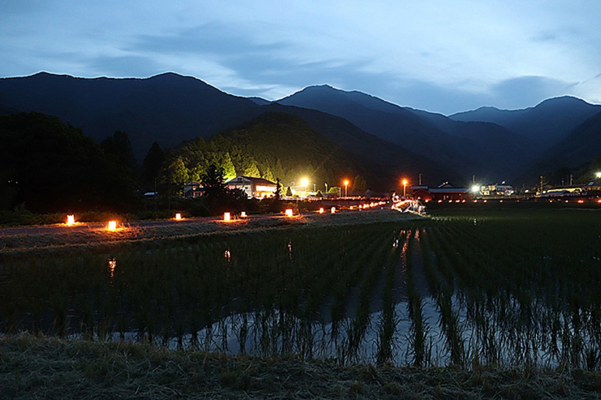 山並みや田んぼの水面に映る灯籠の光が、訪れる人々の心を癒し、自然の中で感じる温かなひとときは、日常を忘れさせてくれる特別な時間です。
