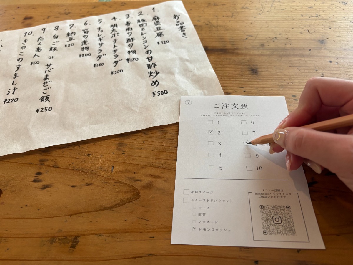 手書きのメニューを見て、食べたいおかずを自分で選ぶスタイルは初めてでしたが、直感を大切に「これとこれとこれ!」と、食べることが大好きな私は次々と決まり、自分ごはんの完成です。