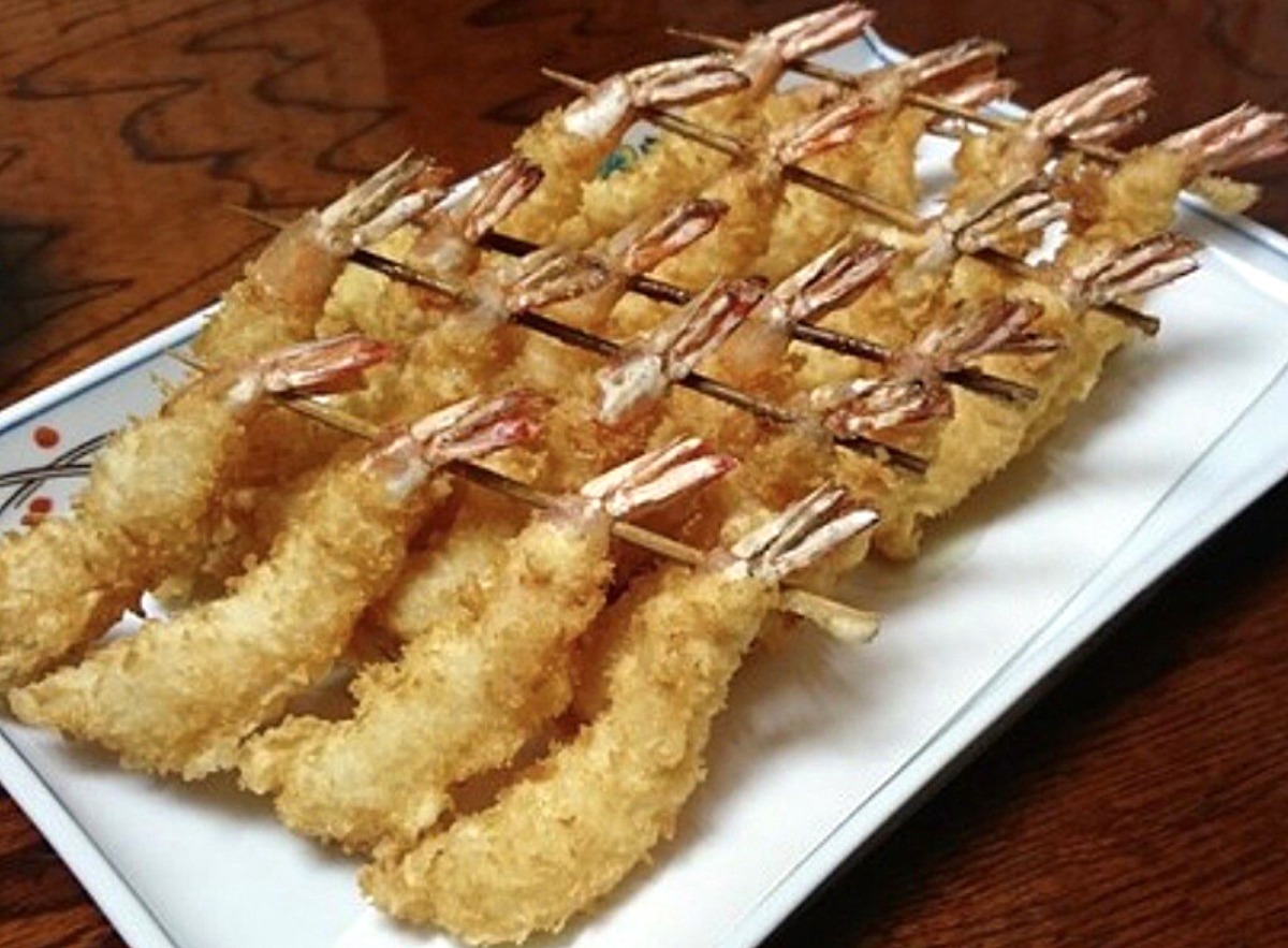 「えびかつ」は新鮮な海老を串に刺して揚げたもので、そのボリュームはもちろん盛り付けにも凝った一品。