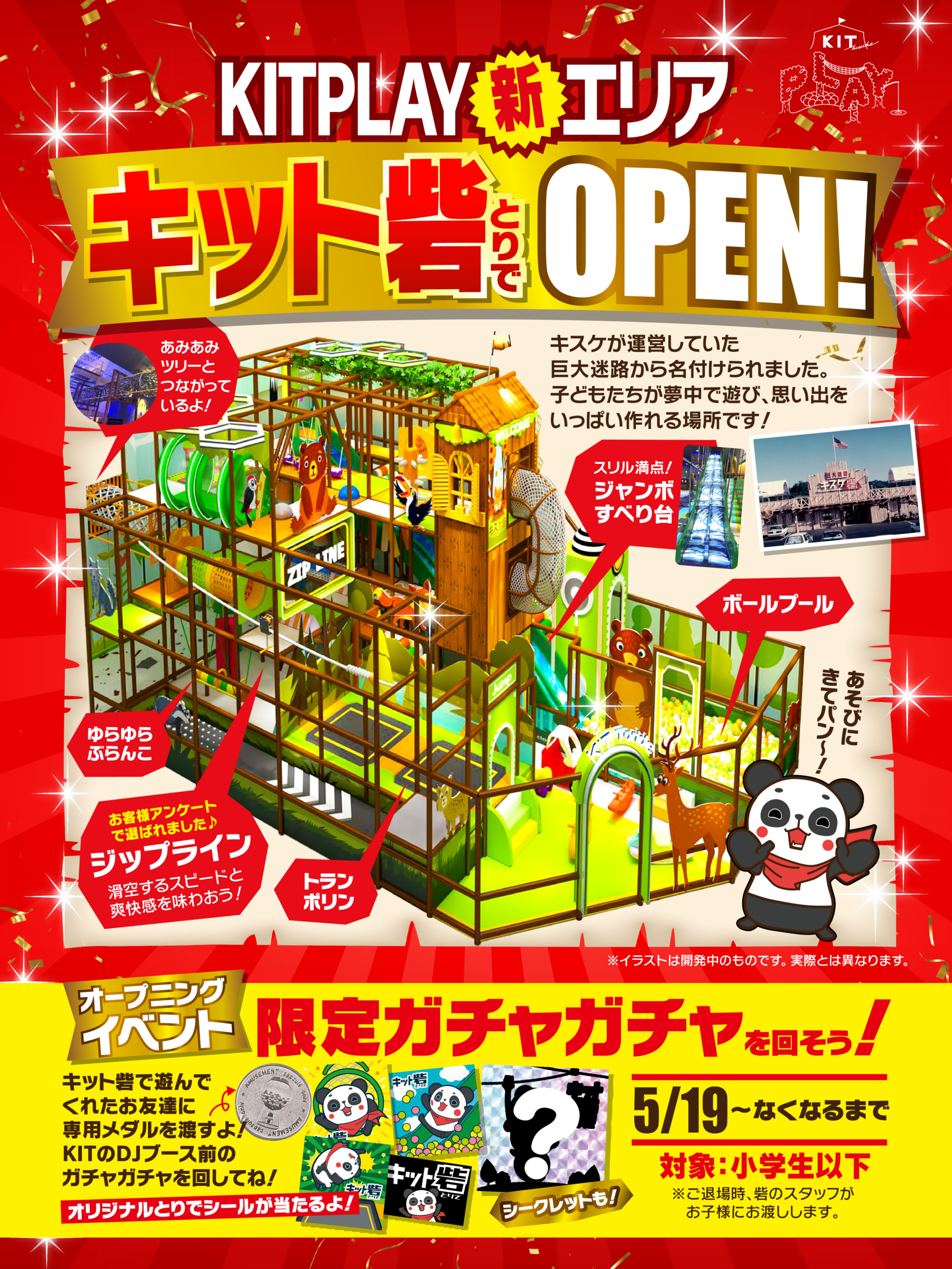 オープニングイベントとして「キット砦」で遊ぶと専用メダルがもらえます。「KIT」のDJブース前にあるガチャガチャをまわして、オリジナルとりでシールをゲットしよう!