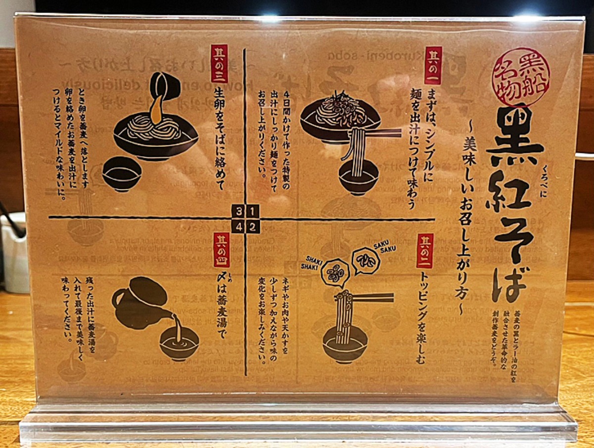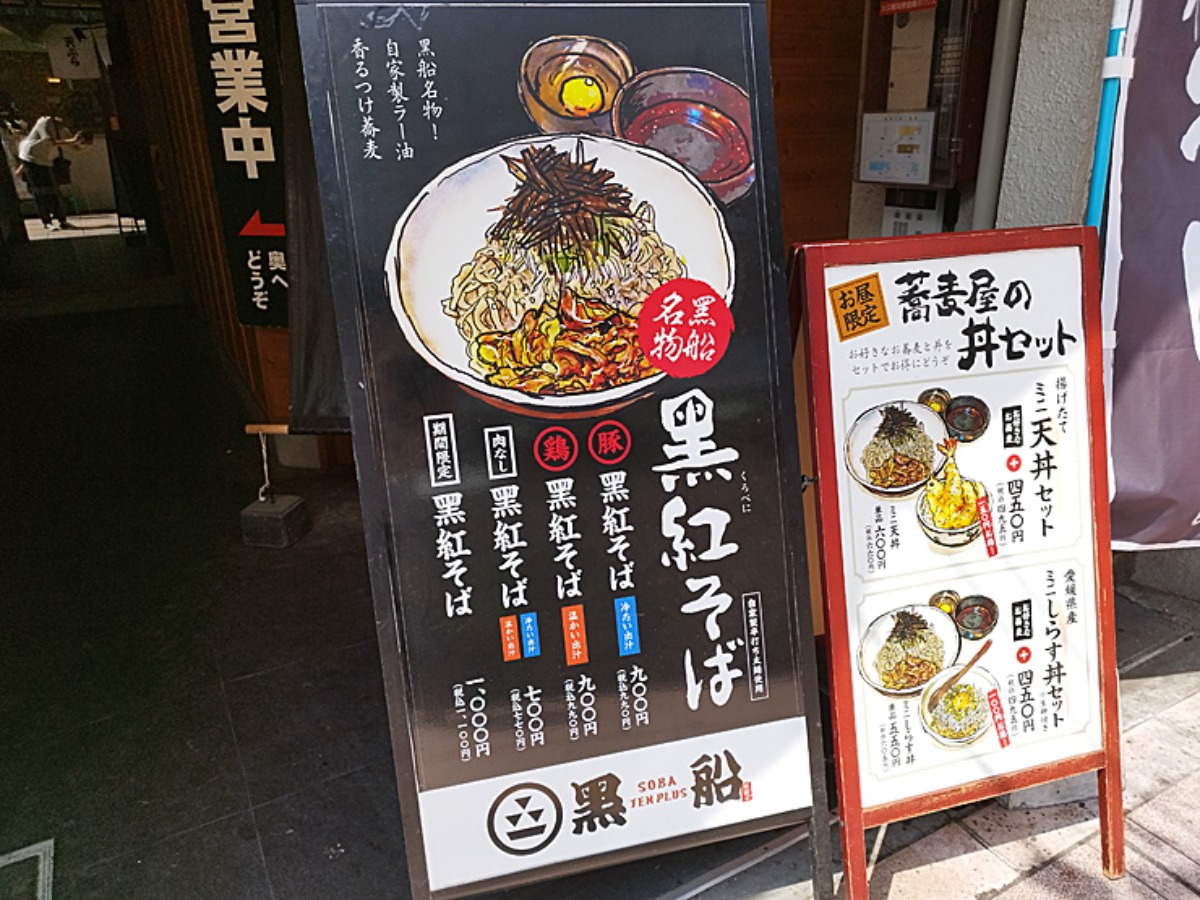 黑船イチオシの黑紅そばの看板がどどん!と登場。冷たい出汁の豚黑紅そばか、温かい出汁の鶏黑紅そばか。どちらも美味しそうで迷ってしまいますね。