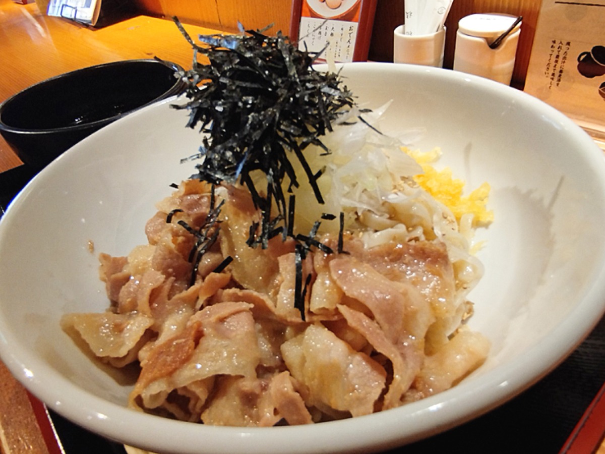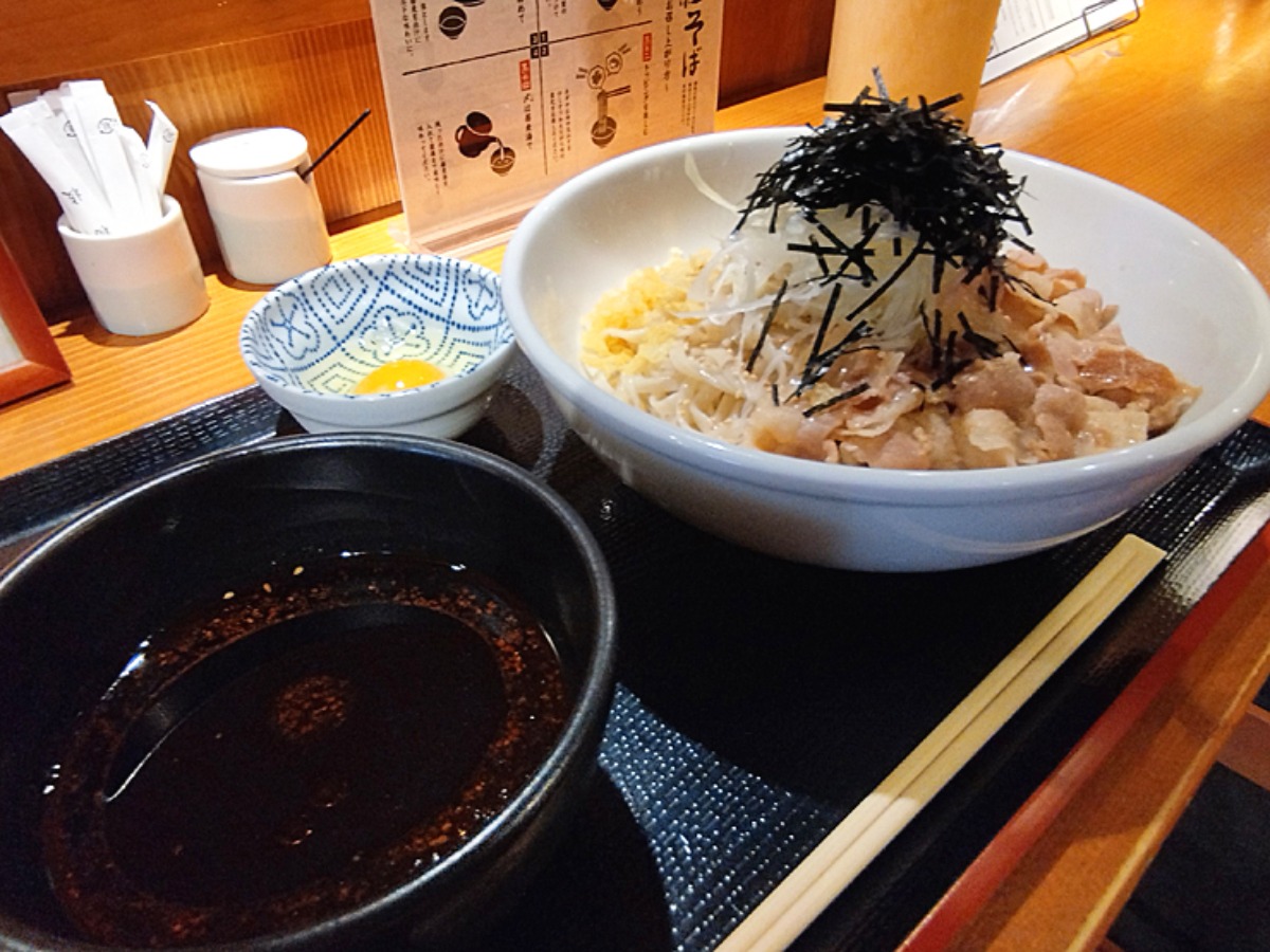 取材当日は暑さも増してきた5月の最中だったので、今回は冷たいお出汁の豚黑紅蕎麦をチョイス。豚肉が輝いていますよ!