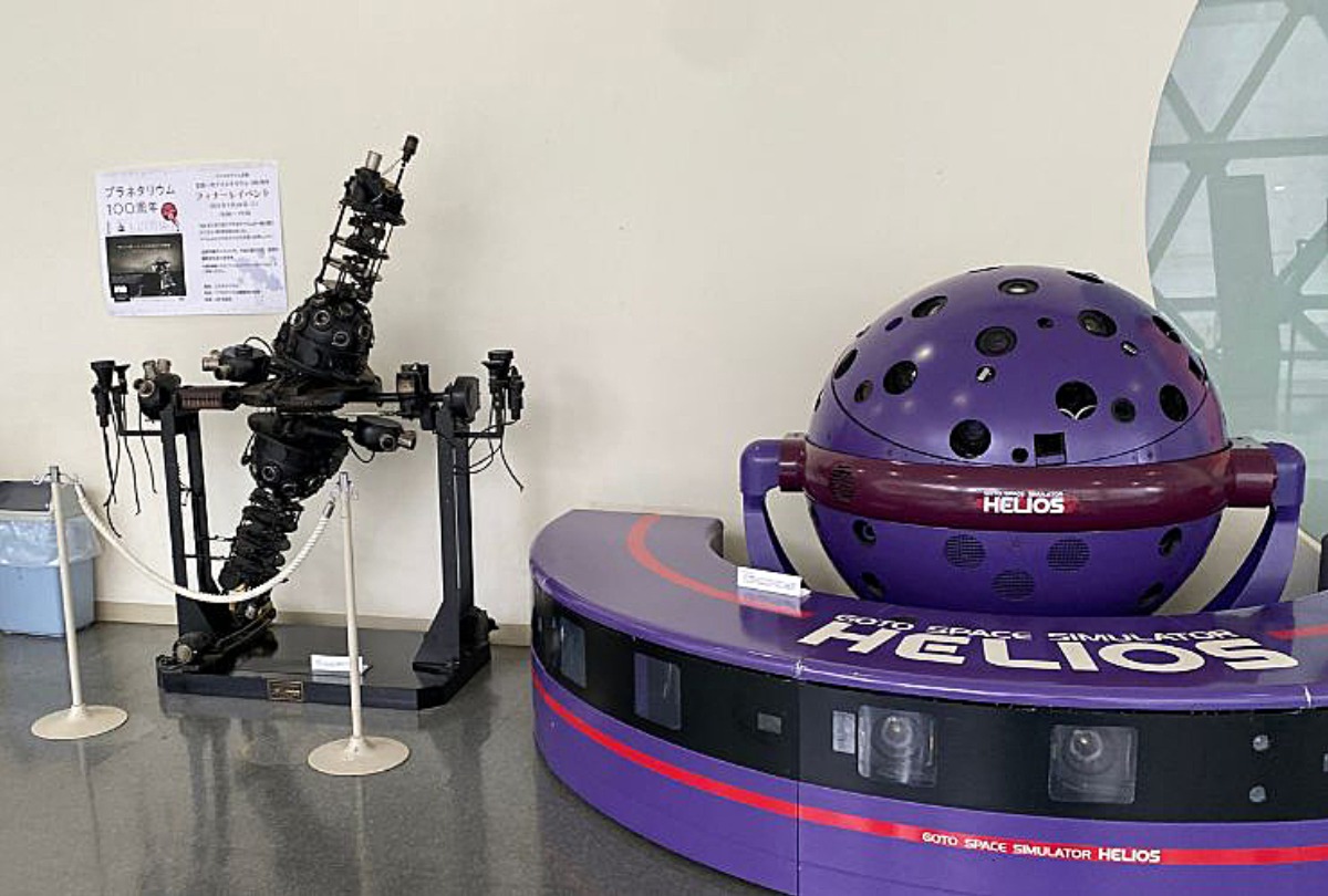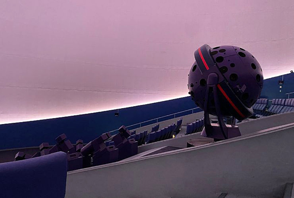 大きな投影機と直径30mのドームスクリーン。