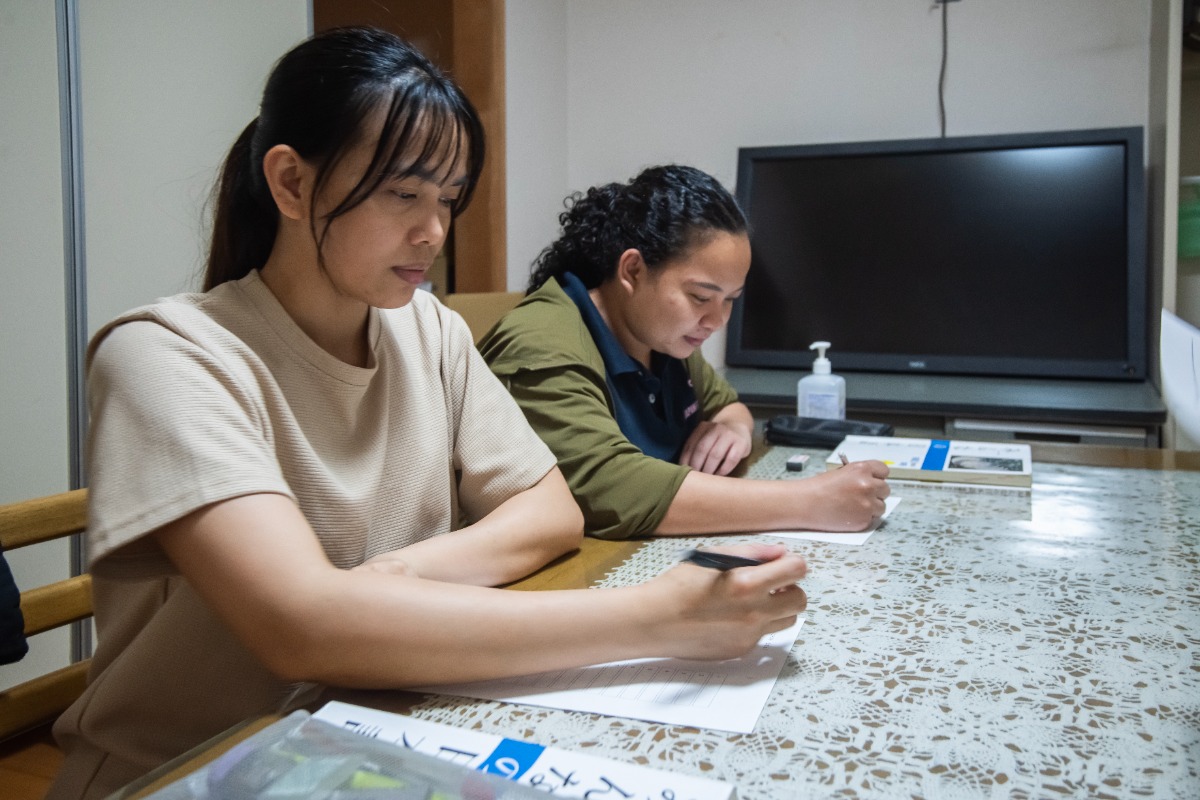 勤務時間内に日本語講師による語学支援を実施し、介護技術と共に学びをサポート。国を超えて助け合う風土が根づいている。