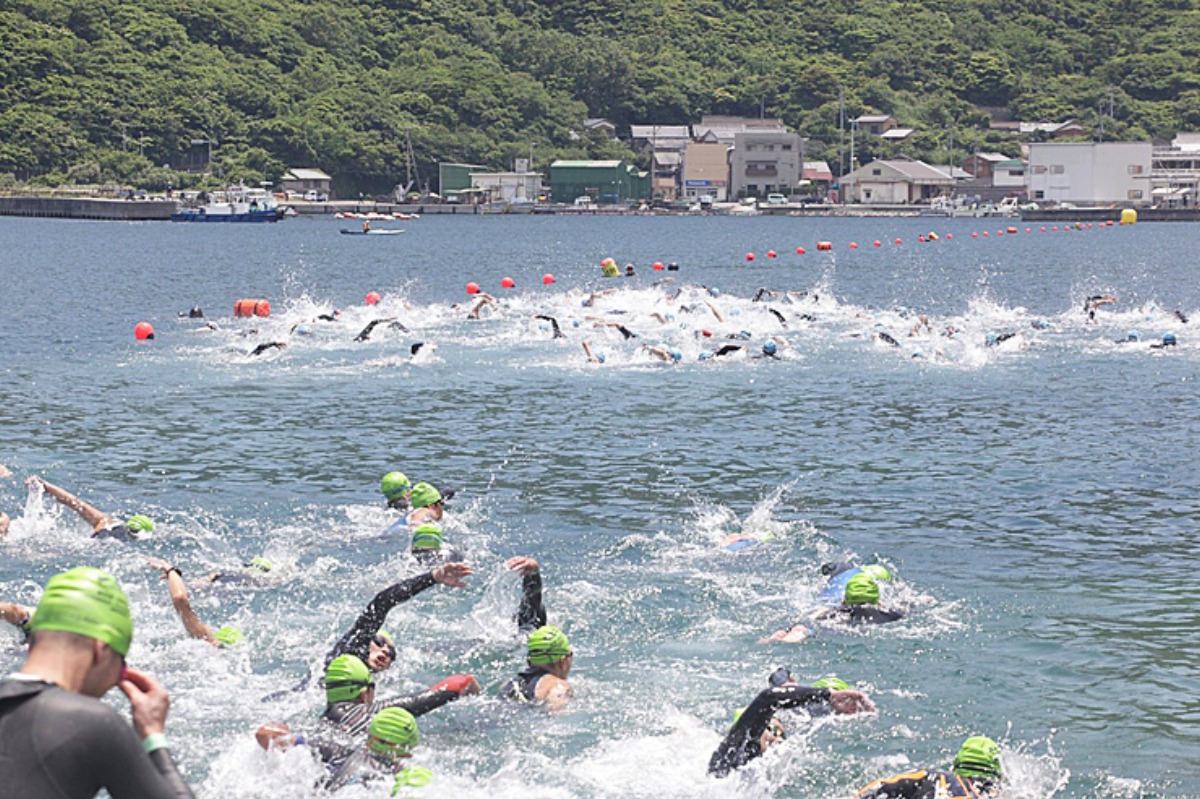 最初の難関、大会の幕開けとなるスイムでは、愛南町の雄大な海を一斉に泳ぎ出す姿がとにかく迫力満点!