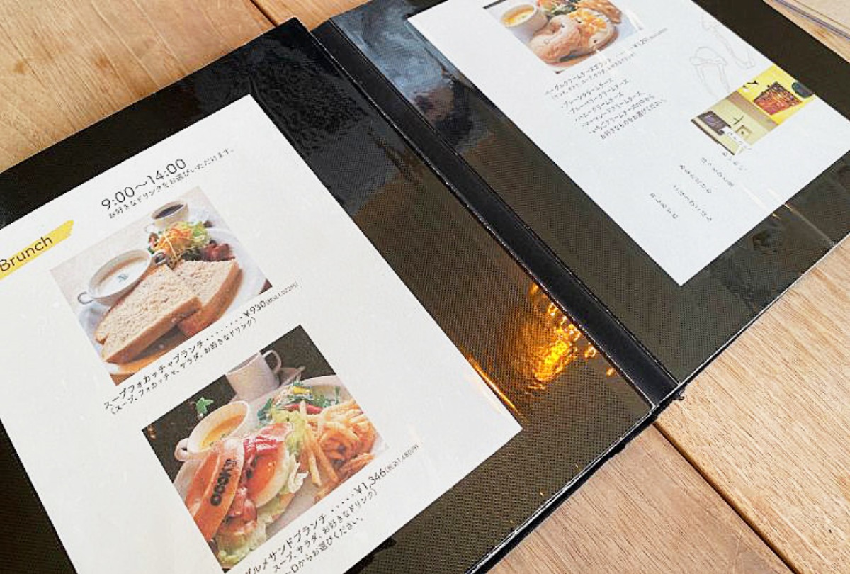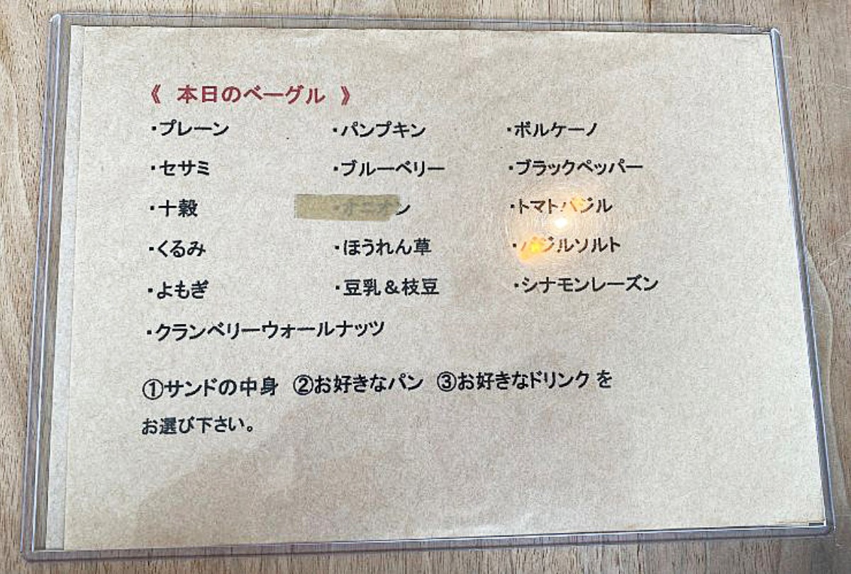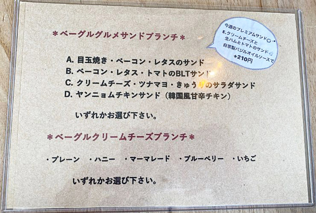 9:00〜14:00までの提供で、スープフォカッチャ、ベーグルグルメサンド、ベーグルクリームチーズの3種類のメニューがあります。