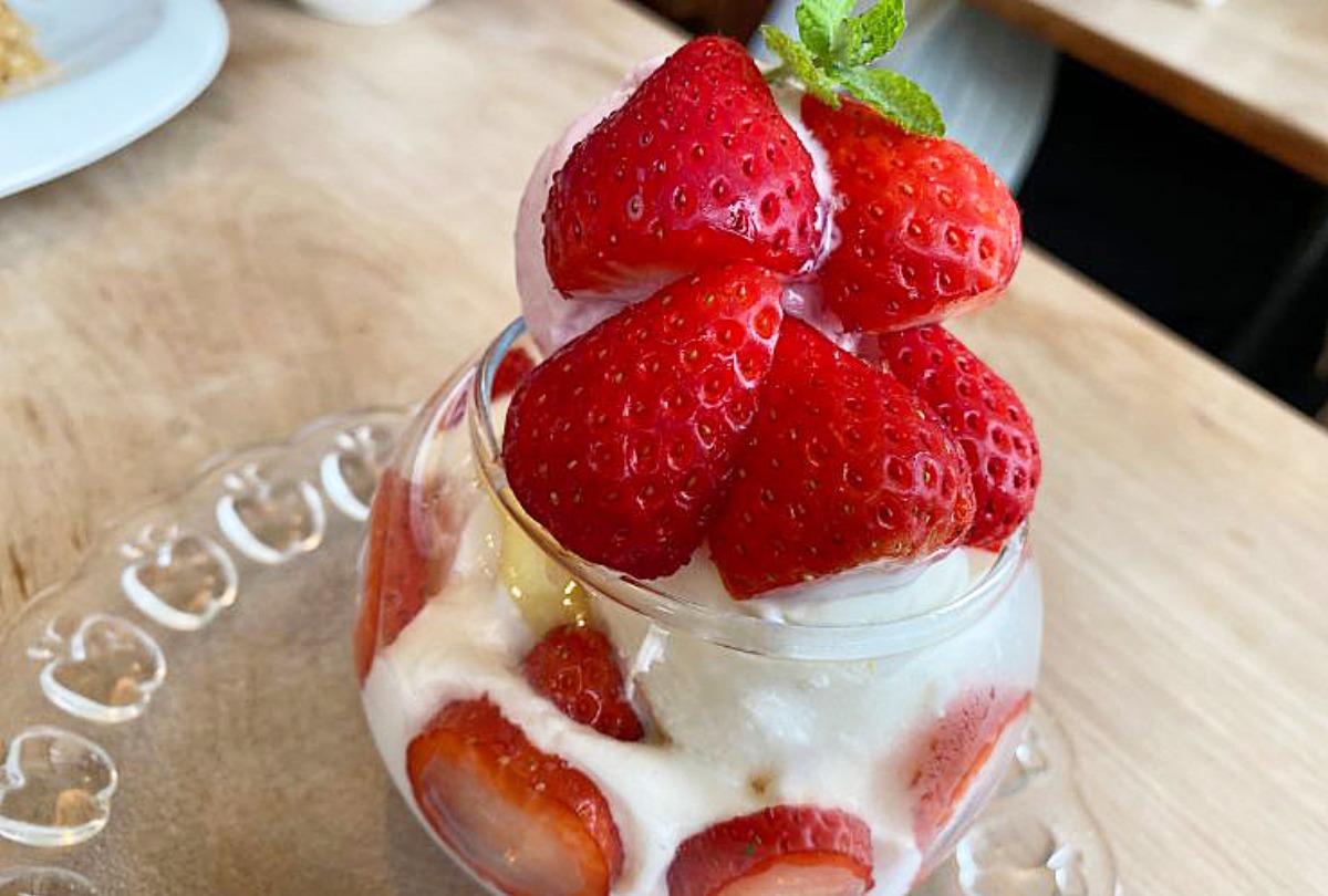 5月はお店が苺推しということで、今回は苺と杏仁のパフェをチョイス。