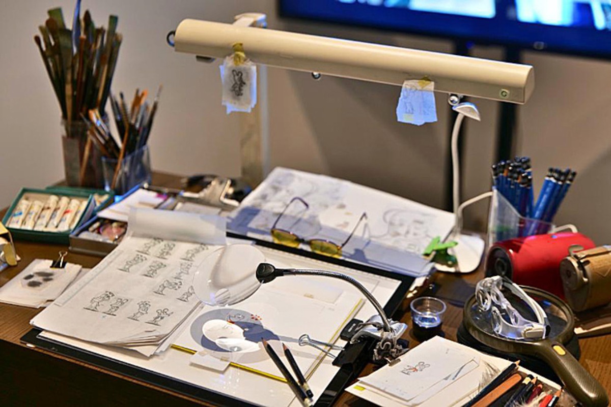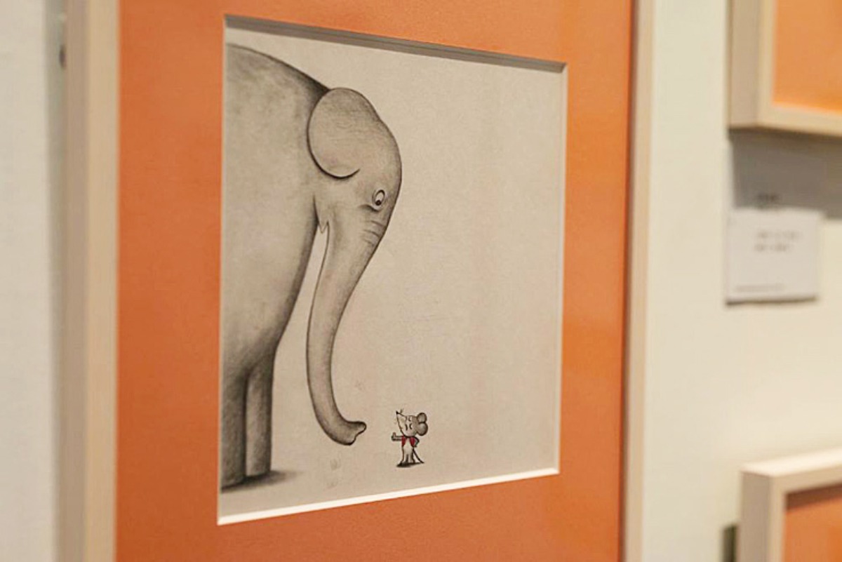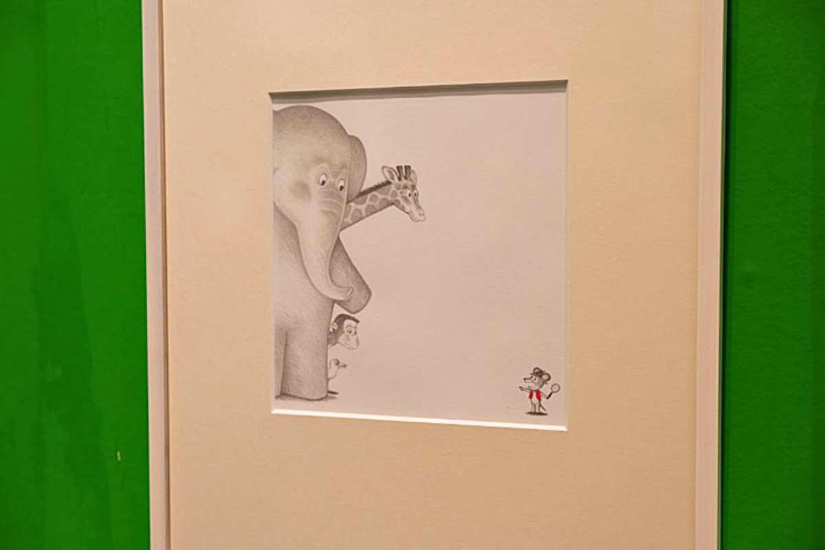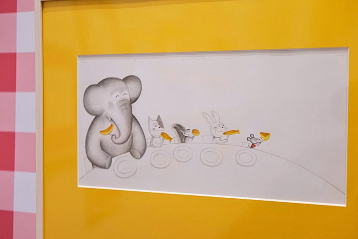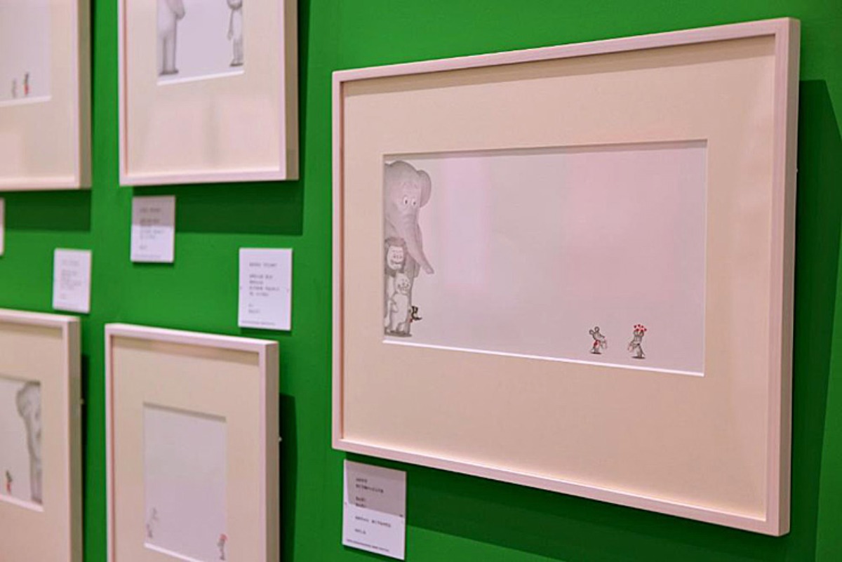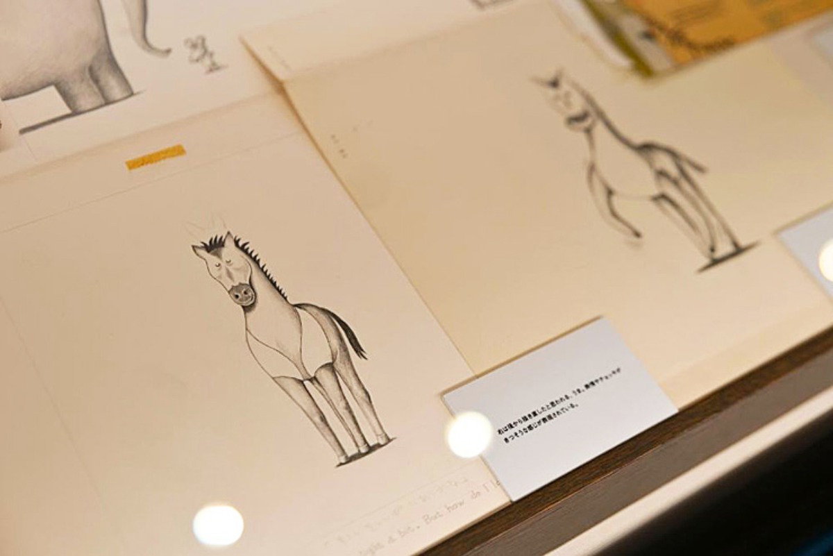 他に、原寸大のラフスケッチや、『ELEPHANT BUTTONS』の絵本、作画する際に使っていたツールの位置指定紙も展示されています。