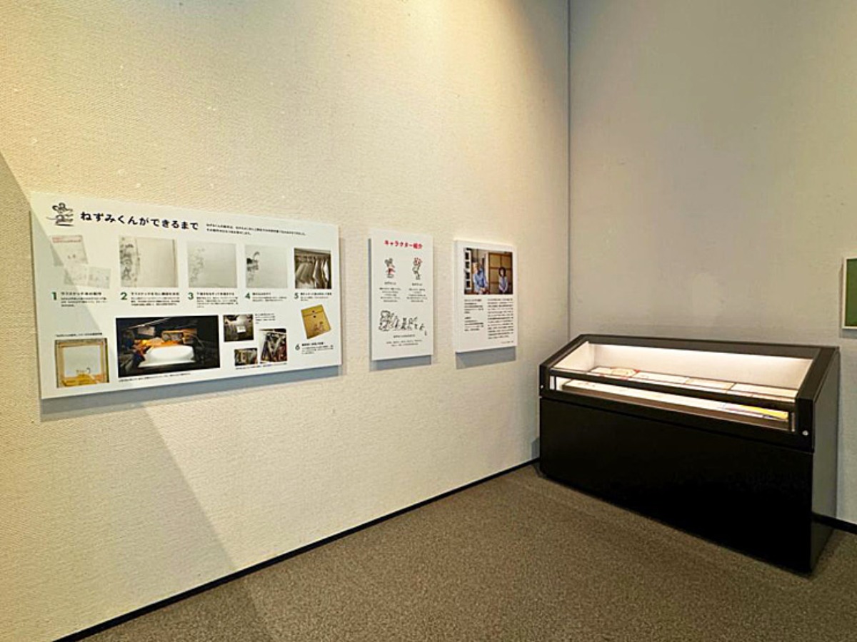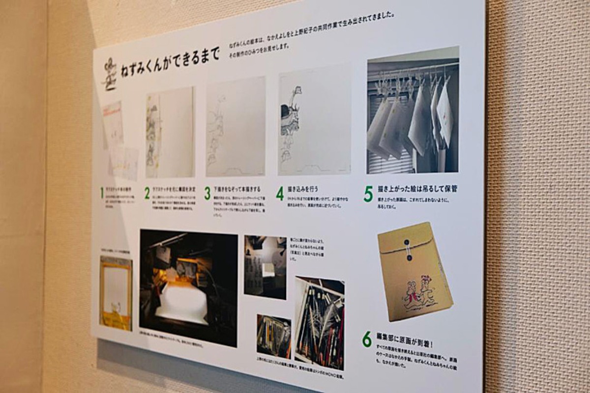 「ねずみくんができるまで」のパネルには、絵本の作り方のヒミツが展示されています。