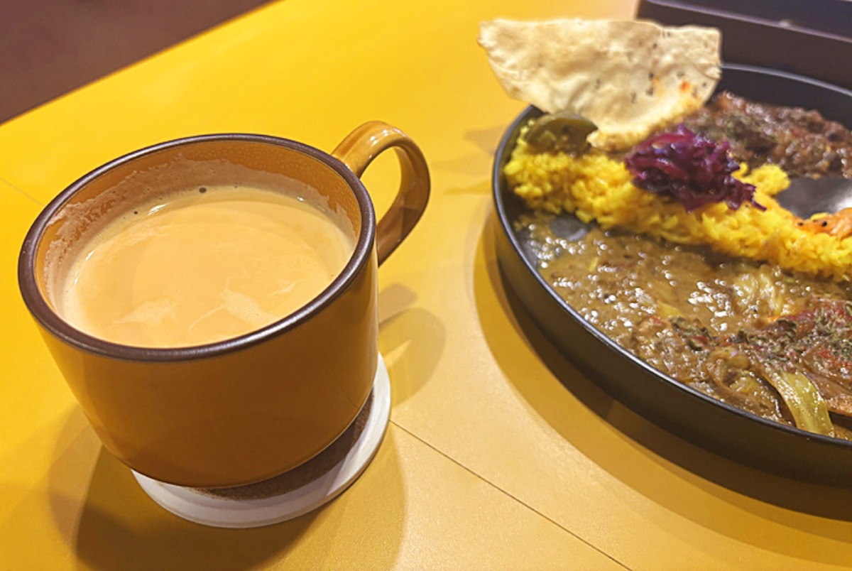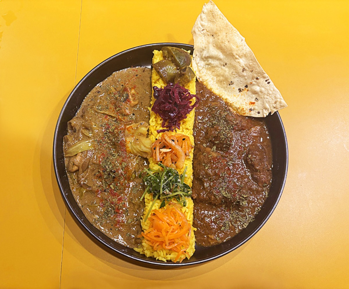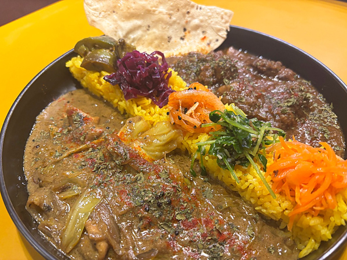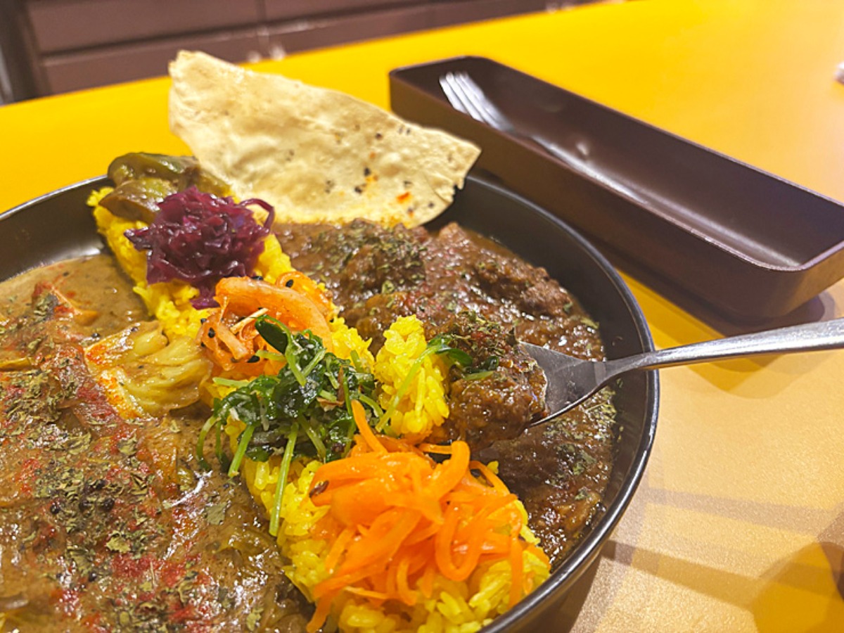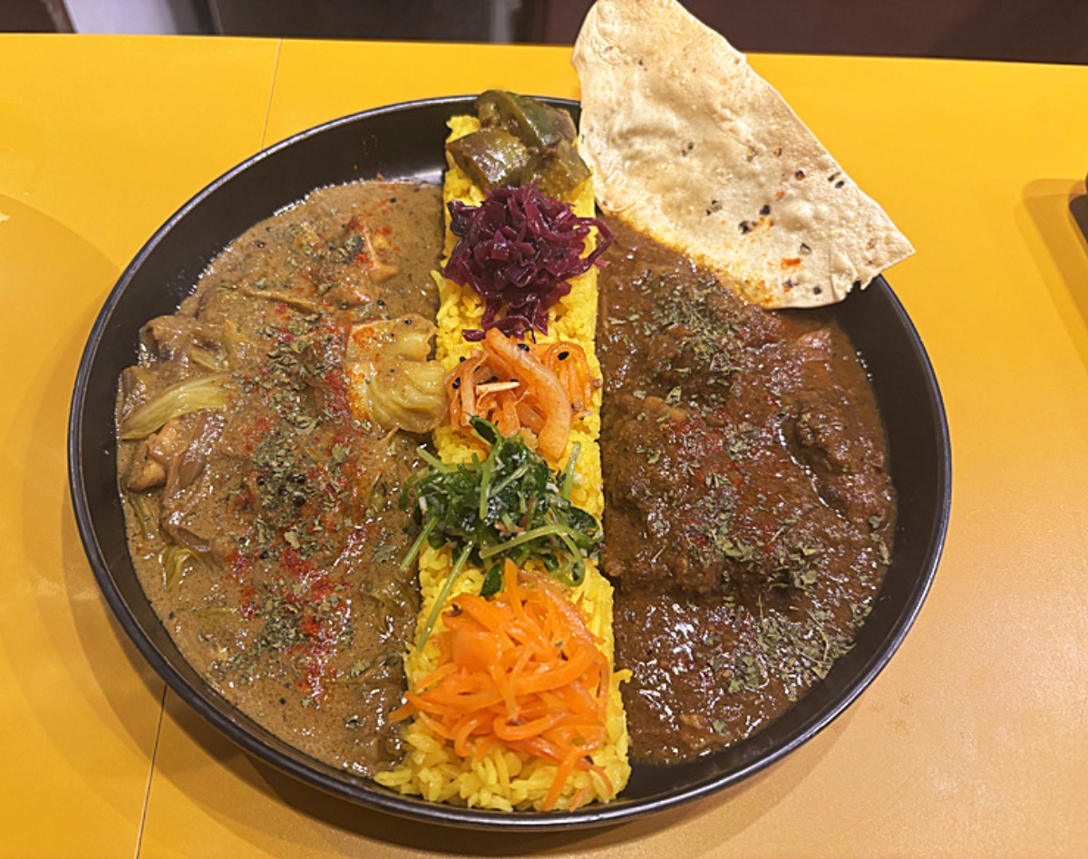 2種類のカレーと副菜をまぜながら、味変をくりかえし、楽しむのがこのカレーの醍醐味だといいます。