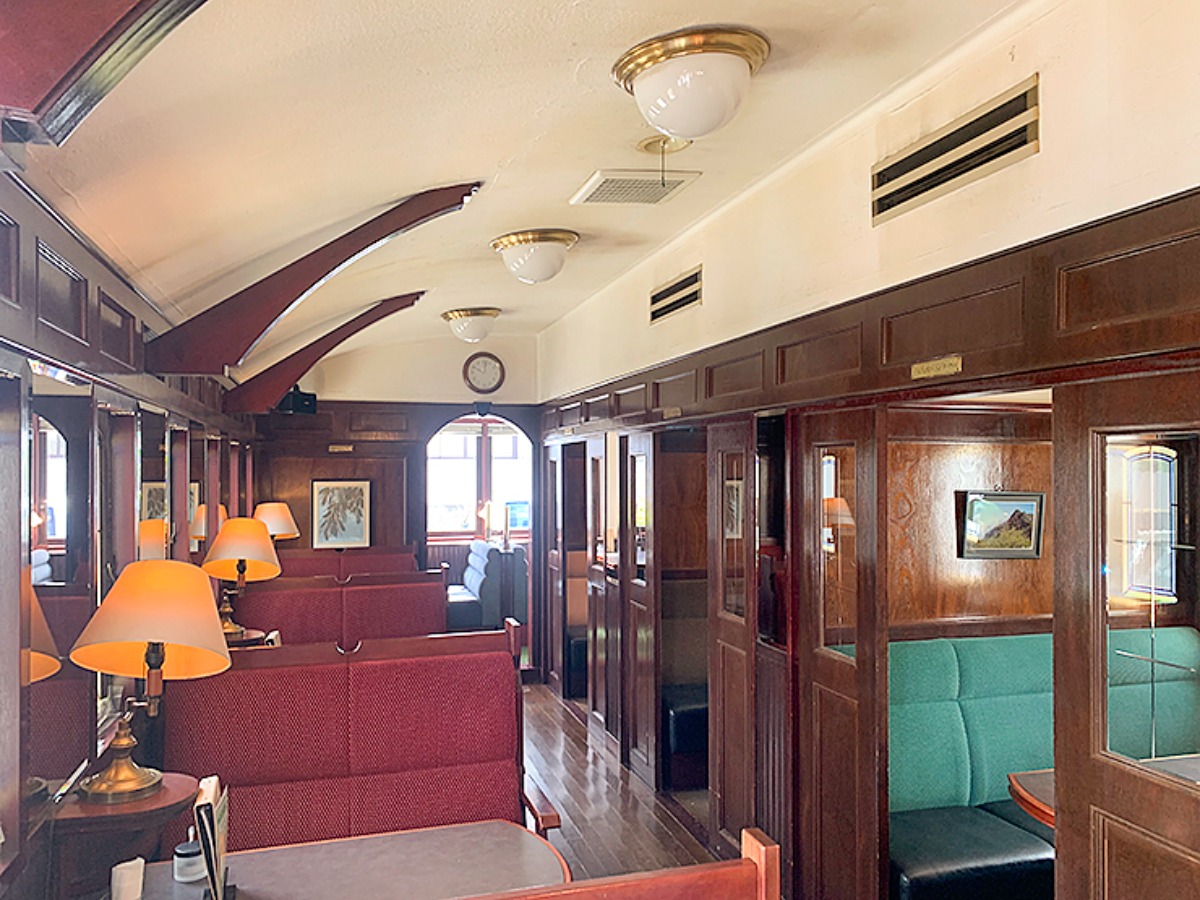 今治では珍しい列車風の店構えと店内の色合いが昭和の良さを残しつつ落ち着いた雰囲気、ゆったり流れる曲はカントリーミュージック。