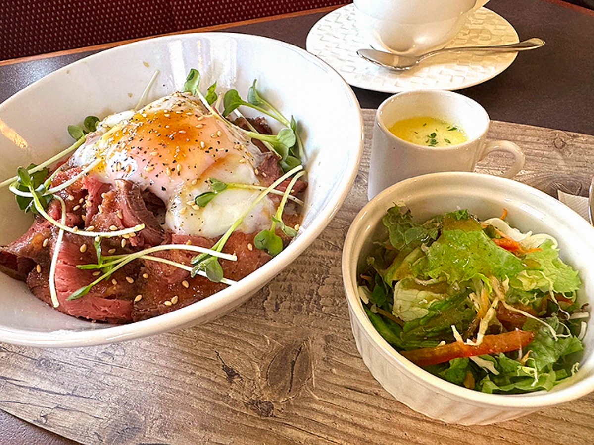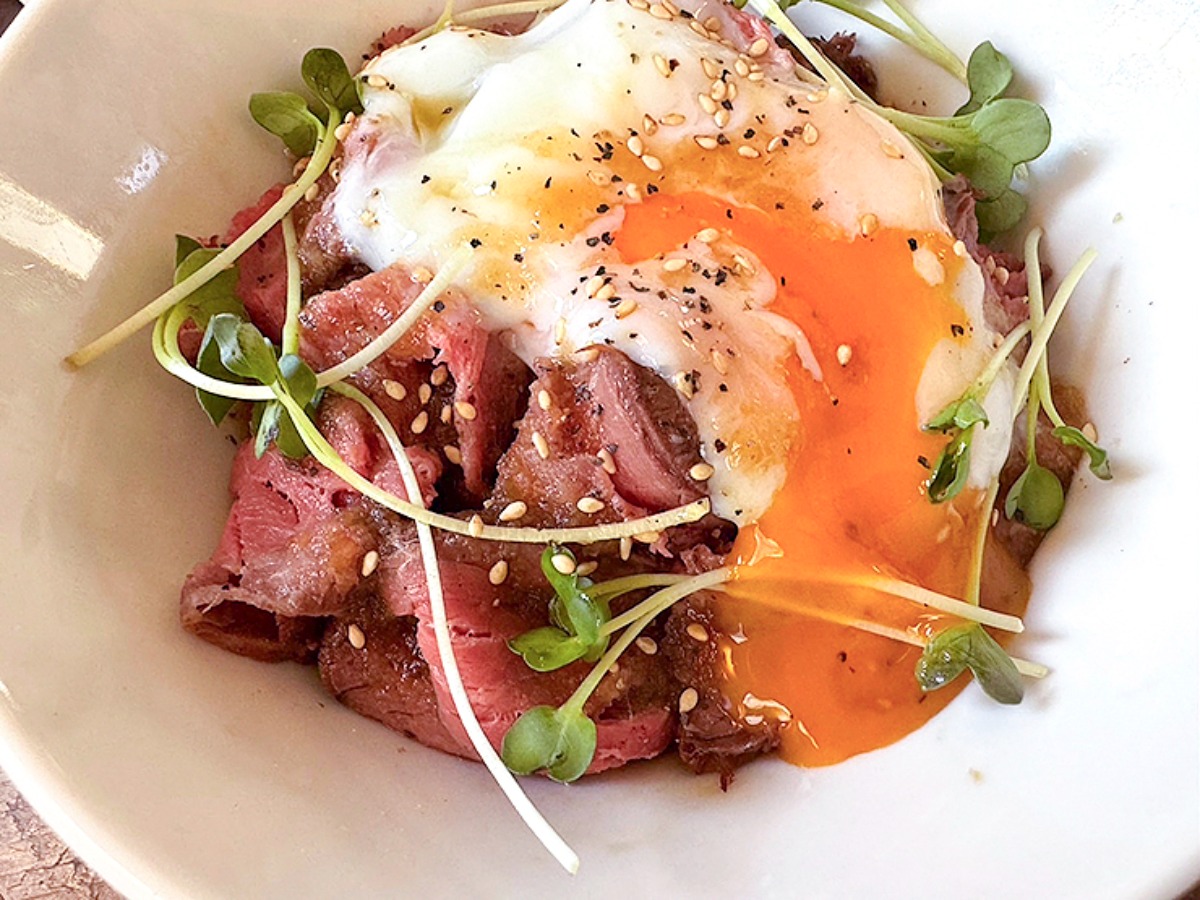 特性のタレに溶け込むお肉のうま味、半熟卵がご飯にからんで絶品!手作りのローストビーフは肉厚で柔らかく一口目から最後まで贅沢な味わいです。