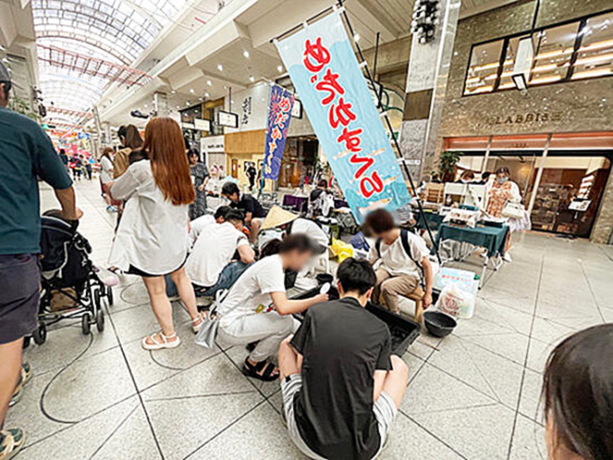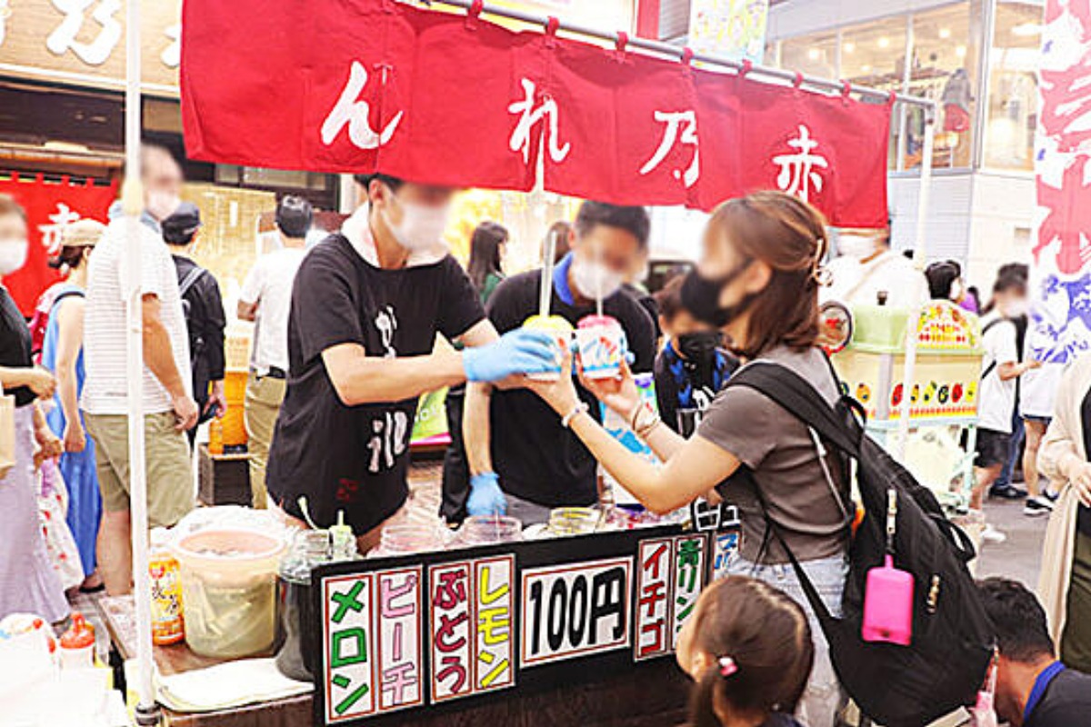 広々としたアーケード内では、たこ焼き、フランクフルト、肉巻きおにぎりなど、お祭りらしさを盛り上げるグルメから、かき氷など夏のイベントに欠かせない涼し気なメニューまで、ずらりと屋台が並びます。