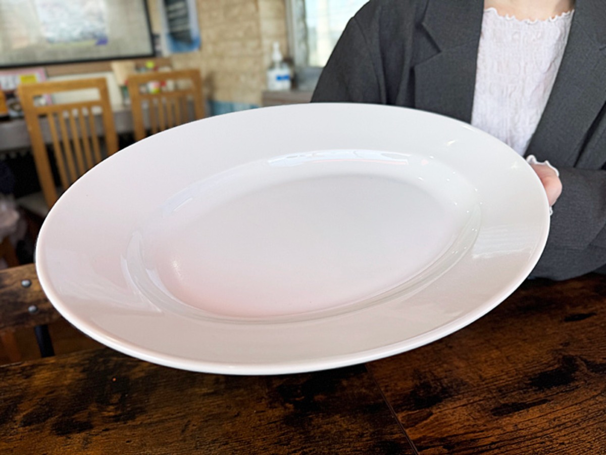 「ここのカレーは本当に多いよ~」と来店されていた常連の方が教えてくれました。「小」は女性にピッタリのサイズ。なんと、それ以降、急に男性向けの量に早変わり!「中」は、お米1合。「大」は、お米4合。「大」用のお皿を持たせてもらいましたが、お皿だけでもずっしりと重量感がすごいんです。