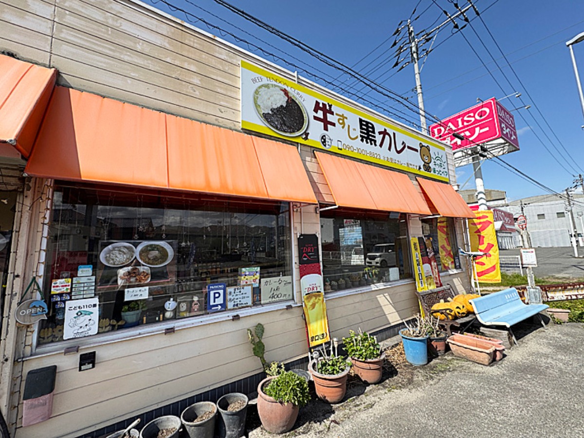 「牛すじ黒カレー」という文字と、トレードマークの可愛いクマのイラストが頭に残る、黄色と白の看板が目印です。