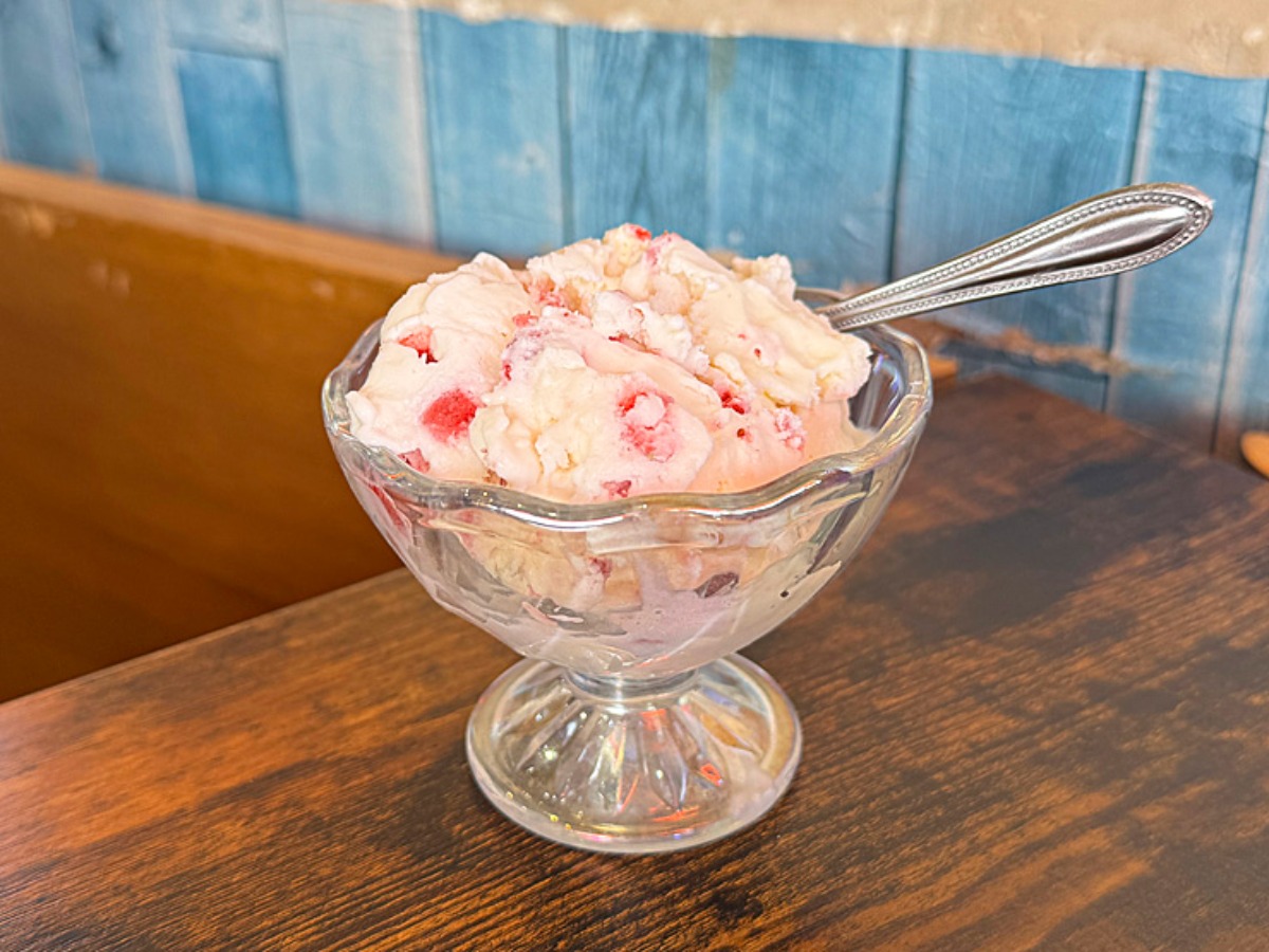 カレーを食べ終わったのを見計らって「お口直しにどうぞ♪」と持ってきてくれたのは、苺の自家製アイスクリーム。