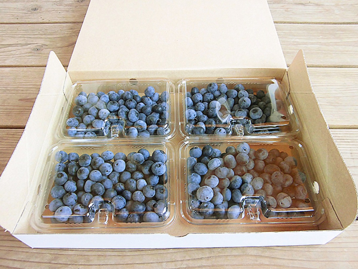 ブルーベリー狩りを楽しんだ後は、持ち帰りや贈答用に購入することもできます。持ち帰りは100gあたり300円、贈答用は500g1,500円、1kg3,000円で販売しています。