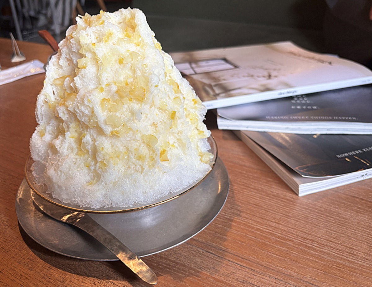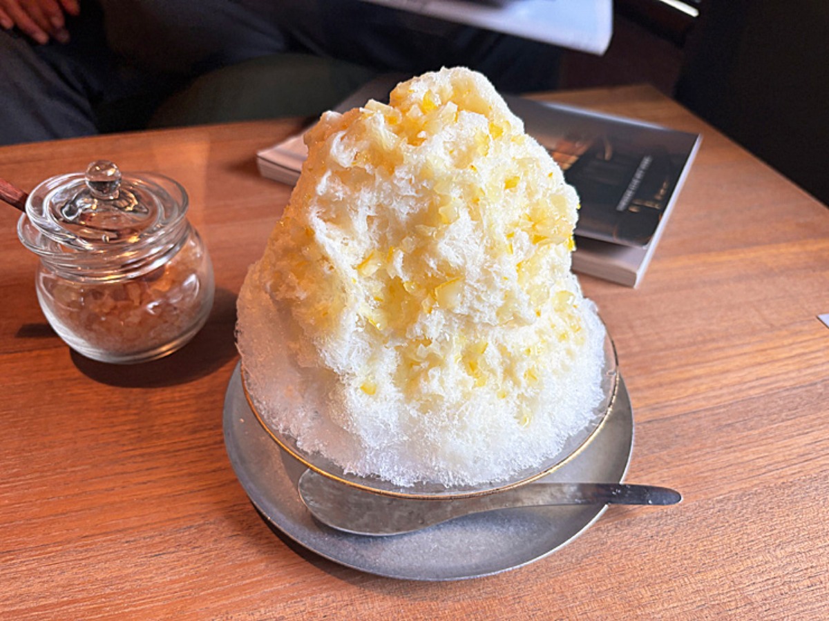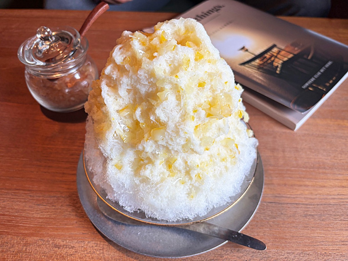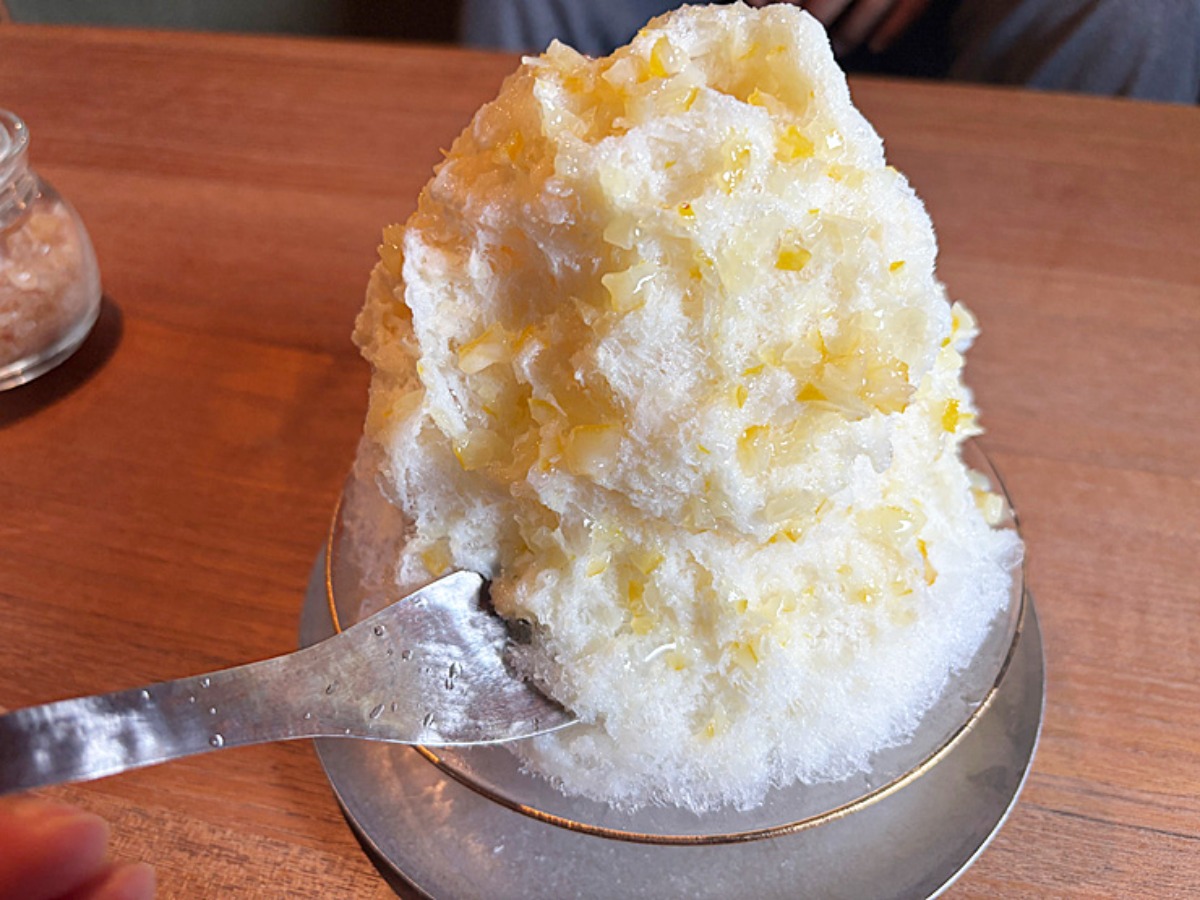 ふわふわ系かき氷に、レモンの果肉がキラキラ。