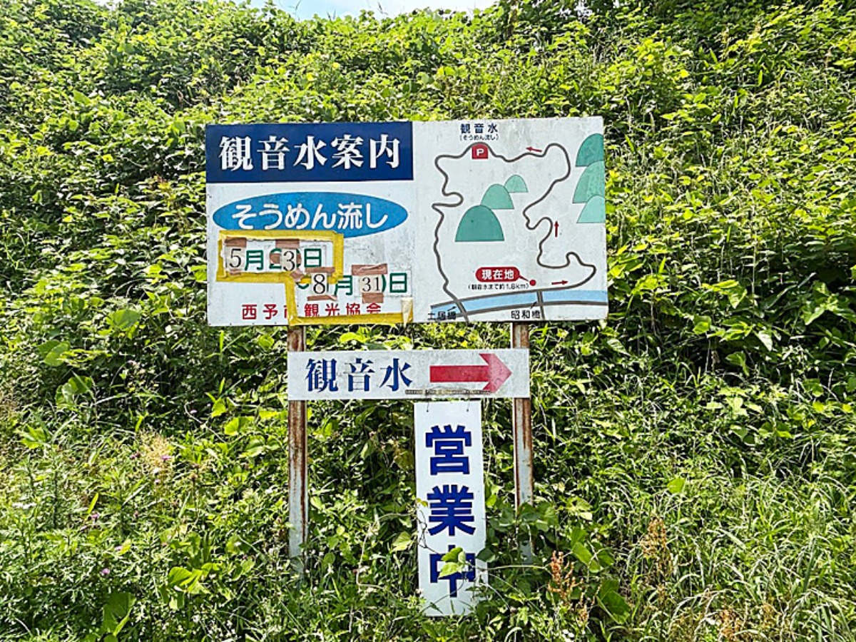 西予市ICを降りて、のどかな田園風景を眺めながら車を走らせると、「そうめん流し」の幟が見えてきました。