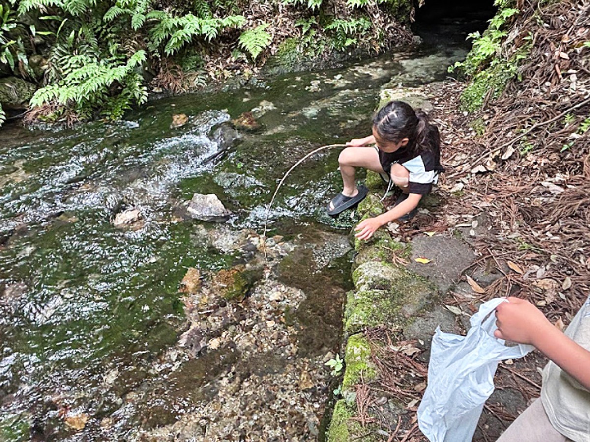 水汲み場にサワガニがいました。捕まえてビニール袋に入れています。生き物もたくさんいて子どもも大喜びでした。ですが、蚊やアブもいたので虫対策をされることをおススメします。