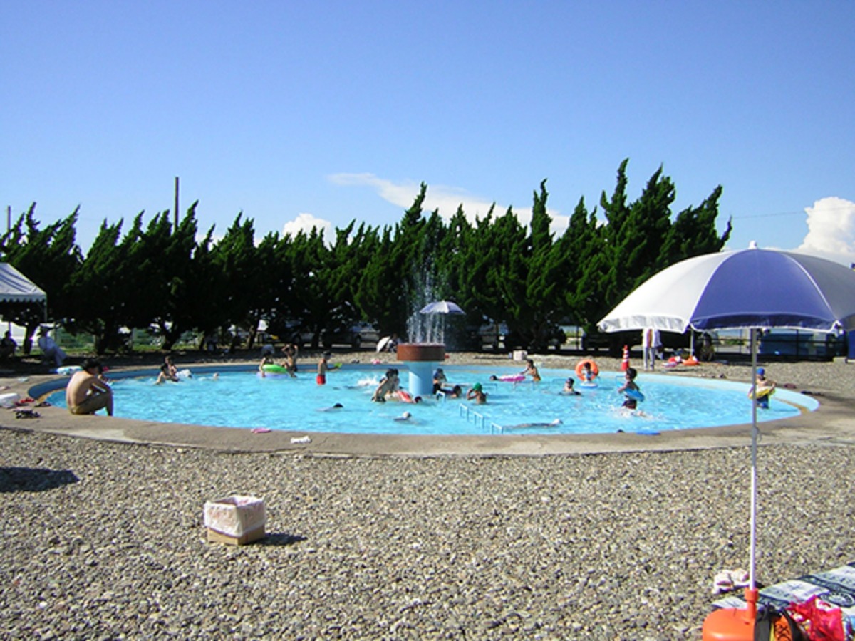 25メートルの大プールと、円形の小プールがあり、大人も子どもも一緒に水遊びができます。シャワールームが2室設置されているので、海水で遊んだ後でも快適ですね。また、トイレも2室、男女別の更衣室も1棟完備されており、一日中、安心して過ごすことができます。