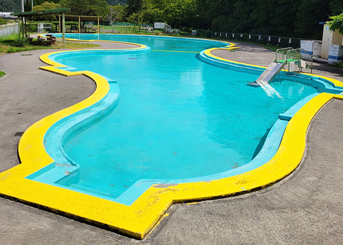 愛媛県の鬼北町にある「ひょうたんプール」。鬼北町役場の側を流れる、奈良川沿いに位置する「近永公園」にあるプールです。