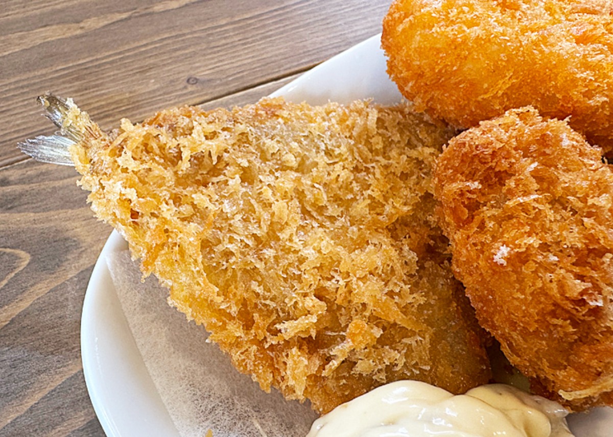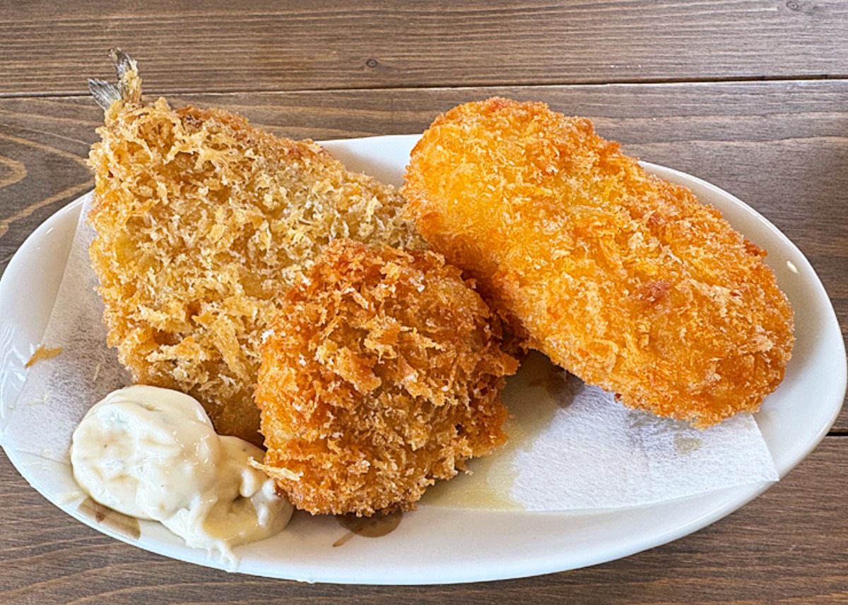 絶対に外せない単品メニューから、キス、ホタテ、そしてエビクリームコロッケをチョイス。