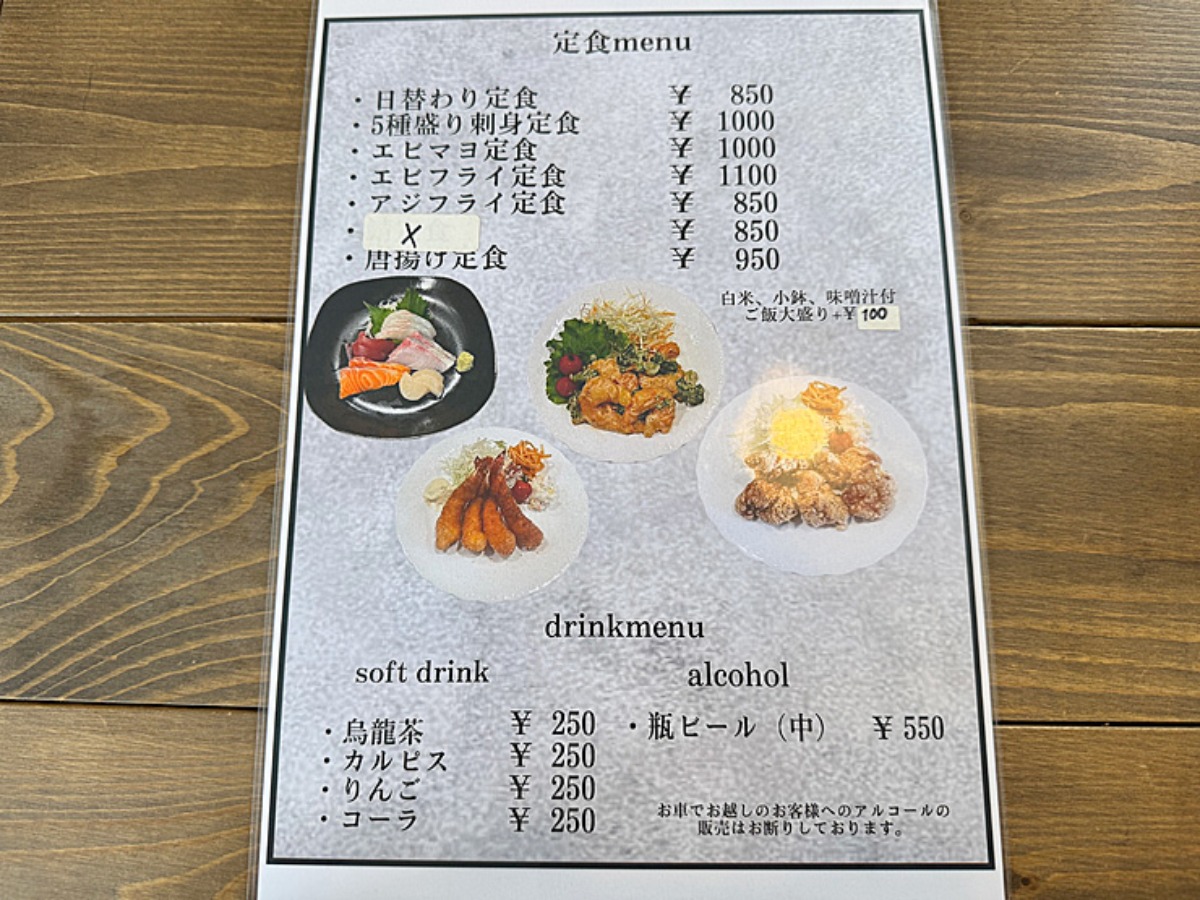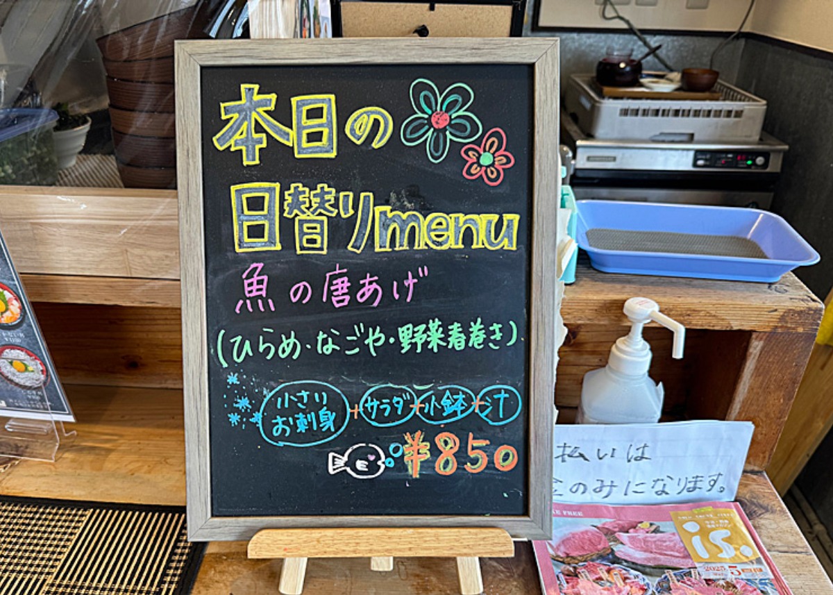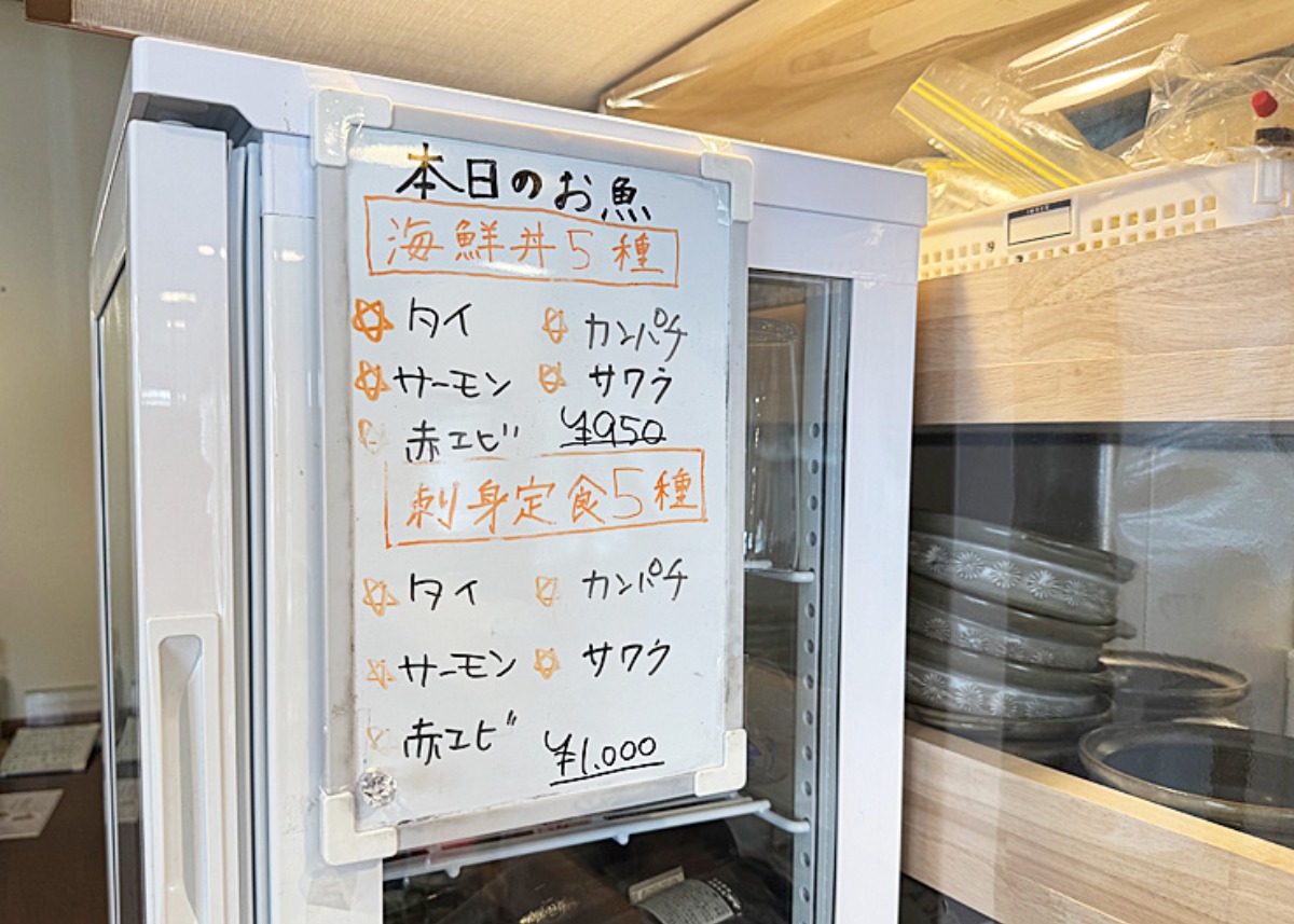 売り切れ必至の人気定食なので、レジ横にある黒板でその日のメニューをまずチェック。さらに、冷蔵庫の横に掲示されている「本日のお魚」も見逃せません。この日はタイ、カンパチ、サーモン、サワラ、赤エビの5種盛り。これが1,000円未満で味わえるなんて、驚きしかありません。