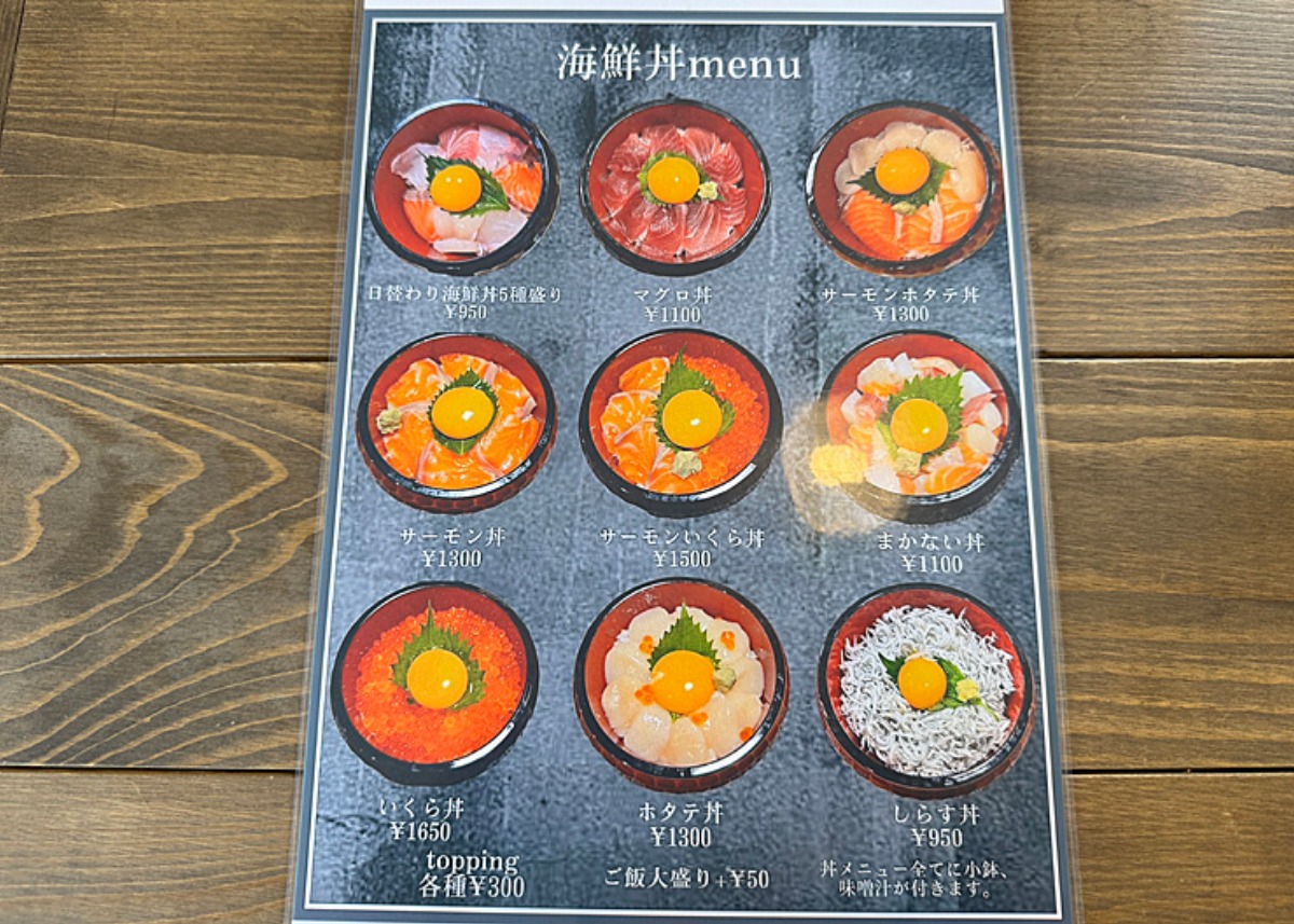1,000円を下回るのは日替わり海鮮丼としらす丼の2品のみでしたが、1,100円のまかない丼もよく注文されている人気メニューだそう。