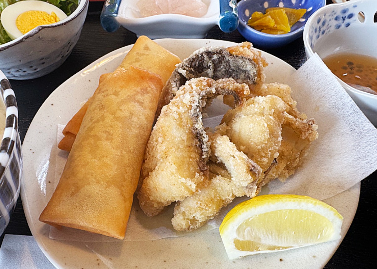 「海鮮丼ってちょっとお高めなイメージがあるけれど、もっと気軽に楽しんでほしい」というのが、店主の想い。なんと、ランチでは日替わり定食が850円という価格設定。しかも内容がすごい。小さなお刺身に、サラダ、小鉢、汁物までついてボリューム満点。取材日の日替わりは、ヒラメとナゴヤの唐揚げに、野菜春巻きというラインナップでした。