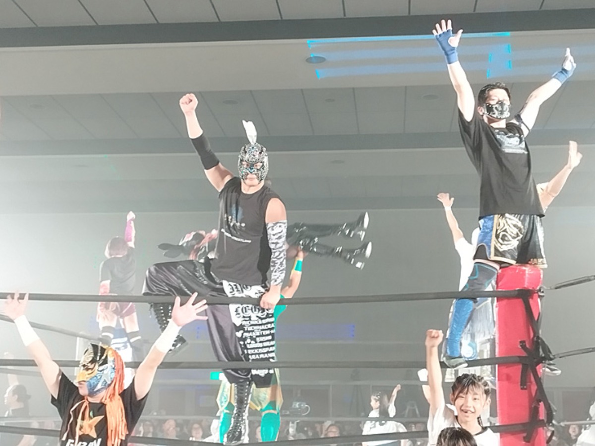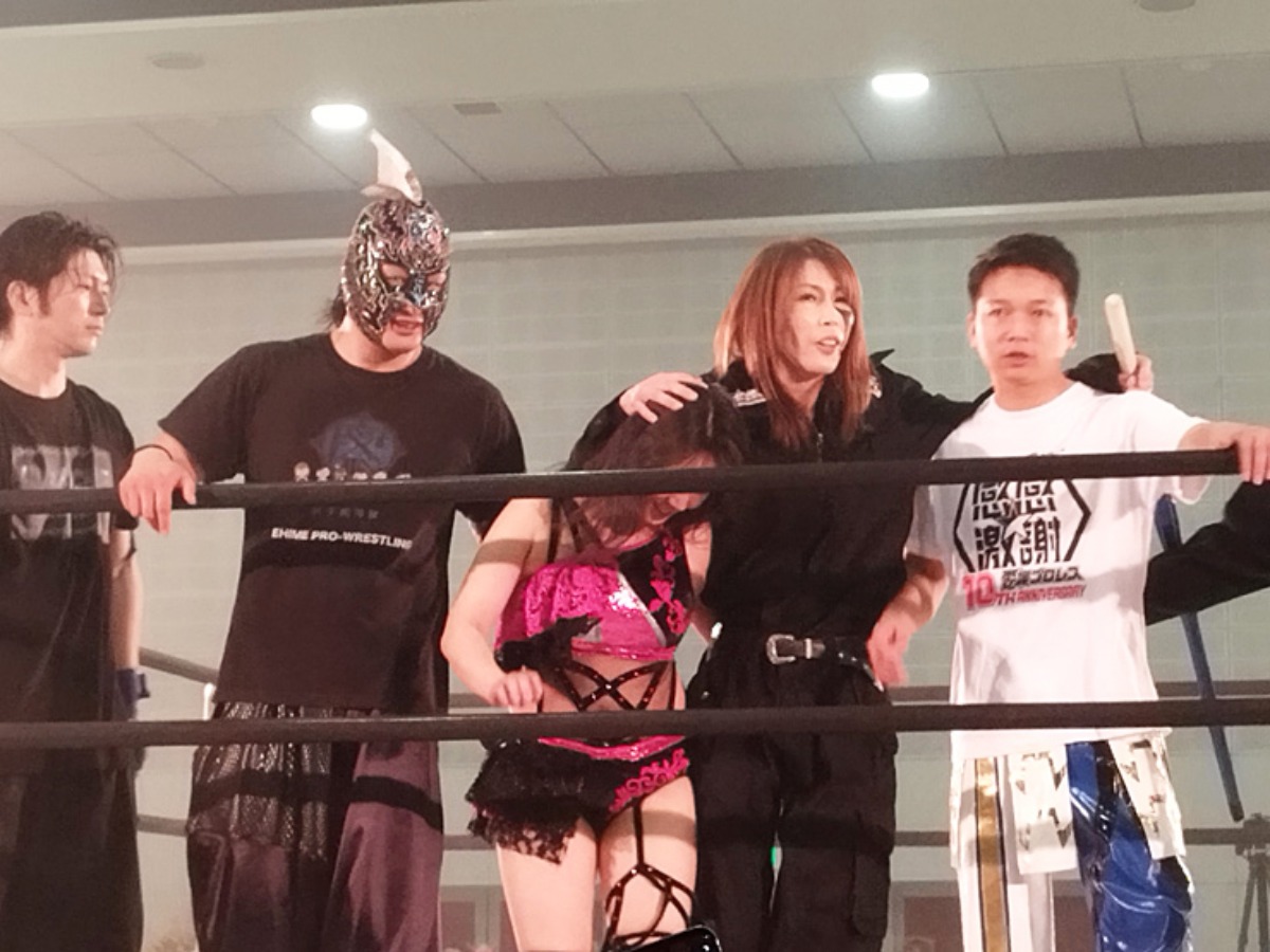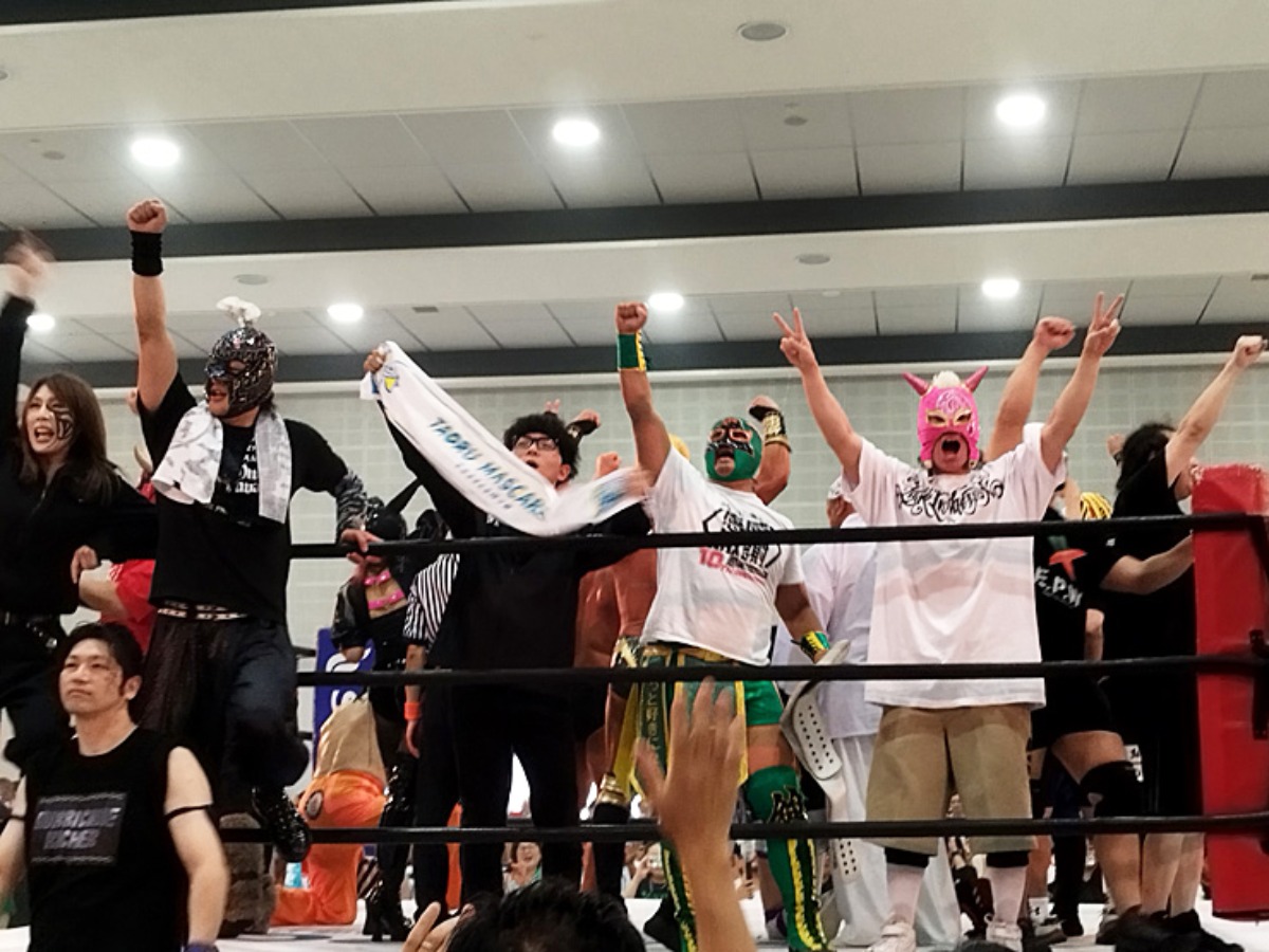 試合はお互いのプライドがぶつかり合う激しい展開が繰り広げられていましたが突如極悪集団「伊予魔神軍」の面々が乱入!仲裁に入ったと思われたKURUSHIMA選手が衝撃の裏切りからまさかの再びの伊予魔神軍入り!豊田選手も伊予魔神軍からの勧誘を受け入れ、悪の軍団入りを果たしたのでした。今後に繋がるストーリーが見逃せません。