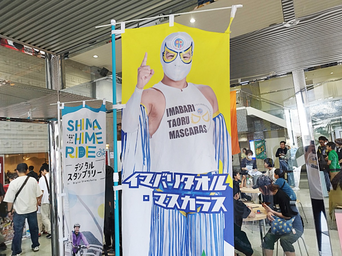 本日のメインを張る今治市出身レスラー、イマバリタオル・マスカラス選手のぼりがお出迎え。
