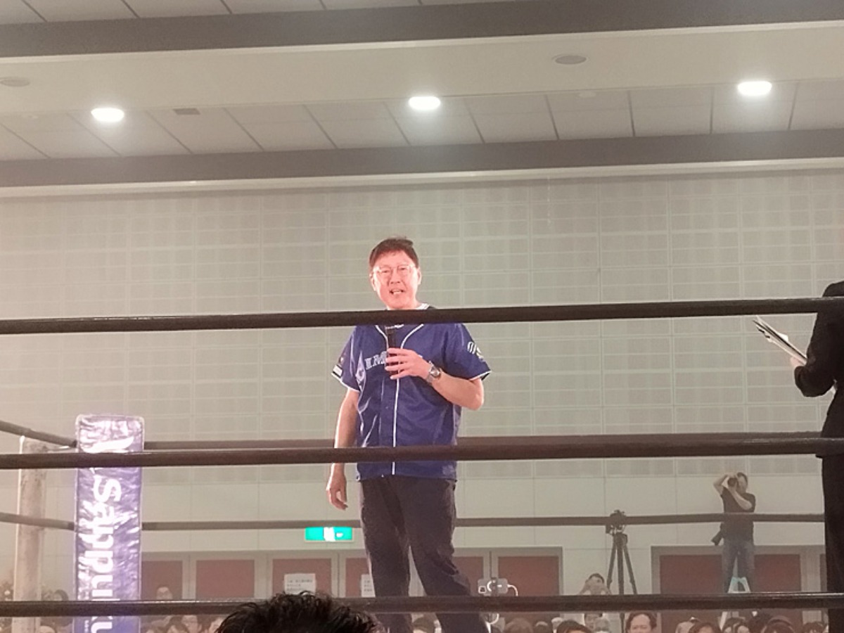 今治市の徳永繁樹市長も応援に参戦!地域も愛媛プロレスの活動を推してくれていることが伝わります。