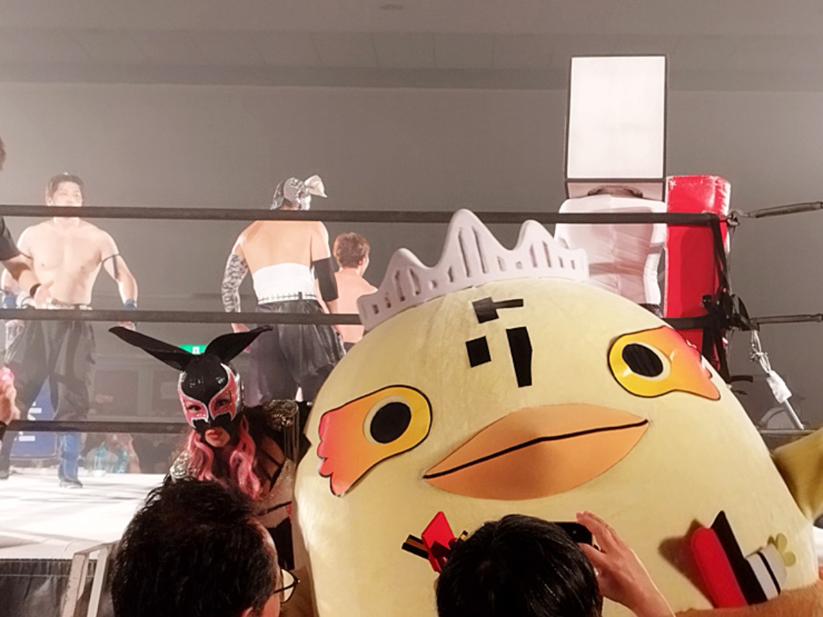 そしていよいよメインイベント、今治市民15万人の期待をその背中に背負ったイマバリタオル・マスカラス選手がプロレス界の王、鈴木みのる選手に挑みます。子ども達の「タオル〜!」という応援の後押しを受けて果敢に立ち向かうタオル選手。厳しく、重い攻撃を食らっても懸命の粘りを見せながら何度も立ち上がるも、最後は鈴木選手の大技ゴッチ式パイルドライバーを浴びて敗北。悔しい敗戦も、会場からは大きな拍手が贈られていました。