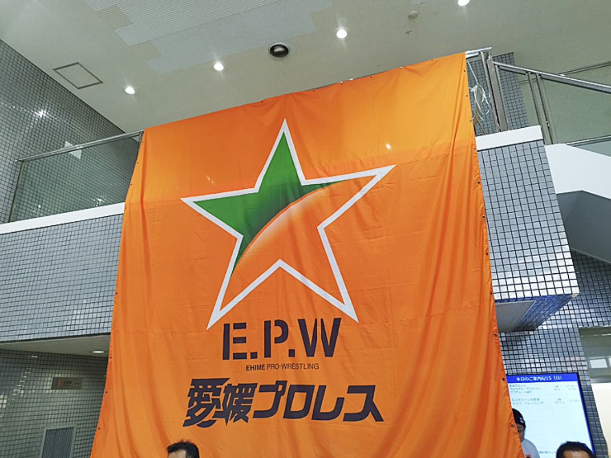 会場内には特大サイズの愛媛プロレス垂れ幕が大会を見守ります。