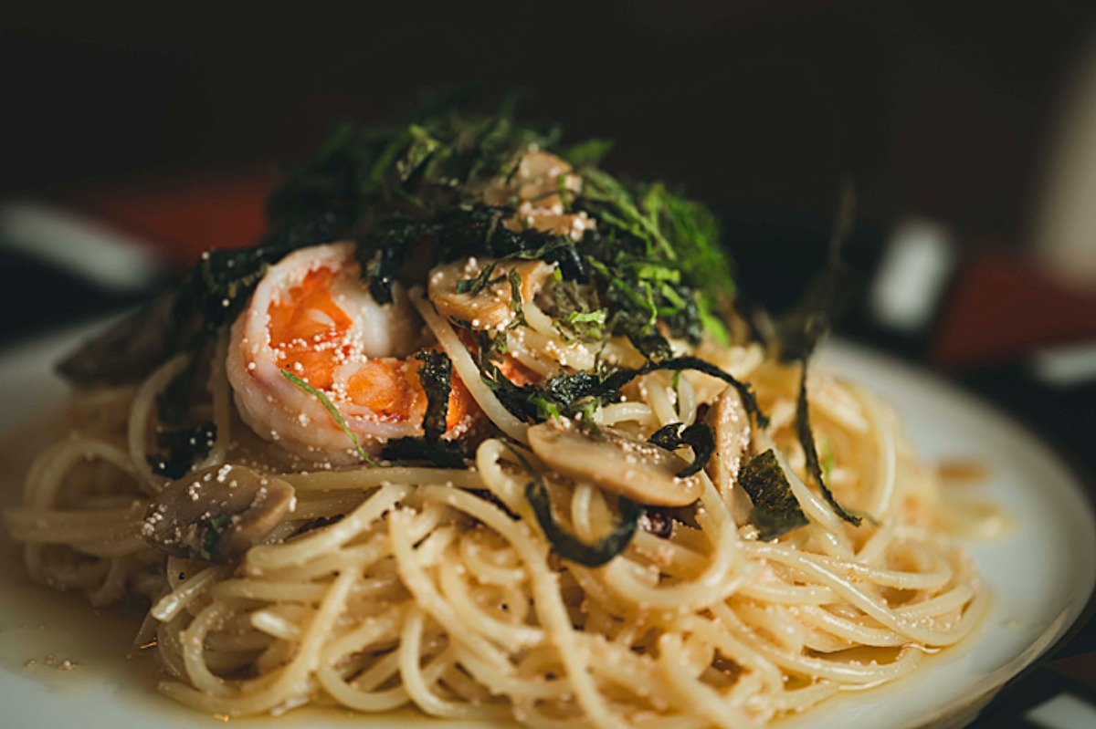 プリプリ食感の大きなエビがのった、たらこスパゲッティが店の一番人気。