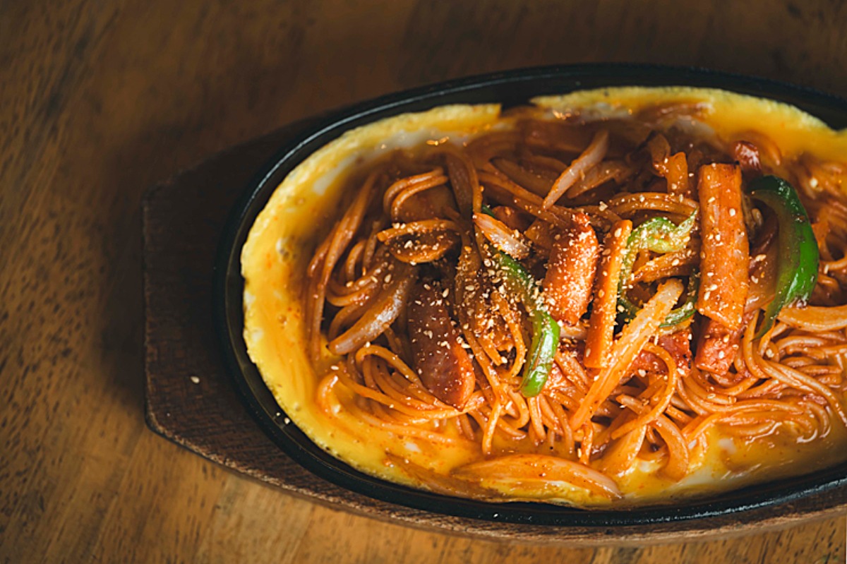 熱々の鉄板に、ふんわりたまごを敷いて、その上にソーセージやベーコン、タマネギ、ピーマンなどの具材を加えた麺を、ケチャップで味付けした王道の一品。