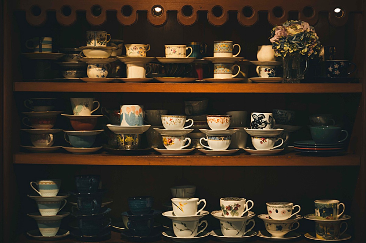 カウンターの奥にずらりと並ぶコーヒーカップは、史恵さんが少しずつ集めたもの。