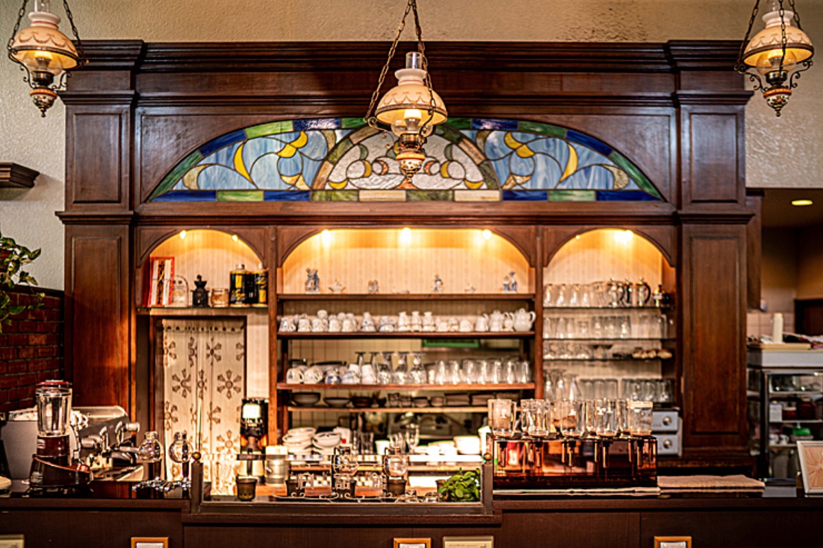 店内は高い天井と美しいステンドグラスが印象的で、落ち着いた雰囲気が漂う。