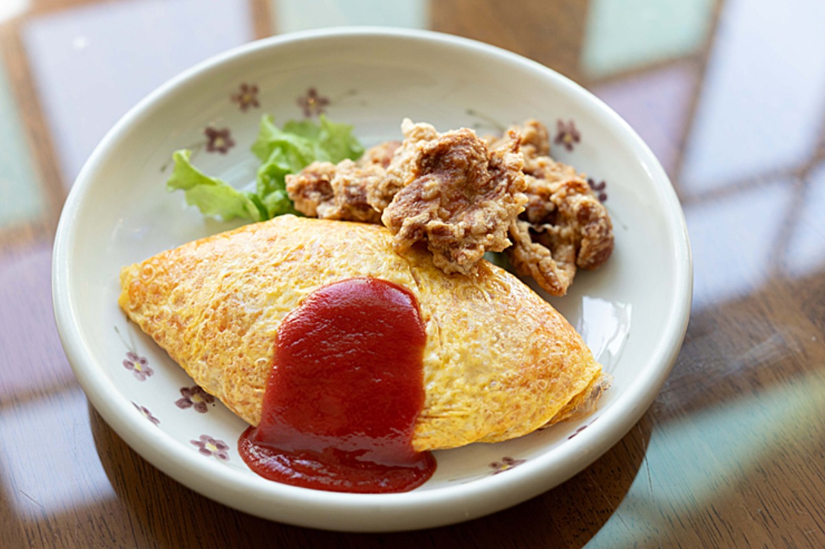 タマネギとマッシュルームのシンプルなケチャップライスを薄焼きたまごで包んだひと皿。