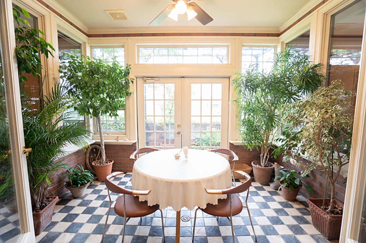 店内の中央に位置し、大きな窓から日差しが入るパティオ席。