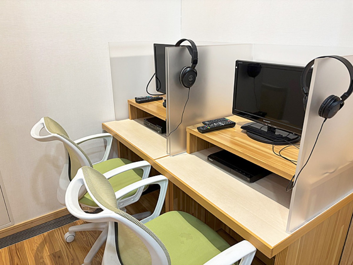 DVDコーナーにはアニメや映画、学習教材など多様なジャンルのDVDが揃っており、専用の視聴席が設けられています。