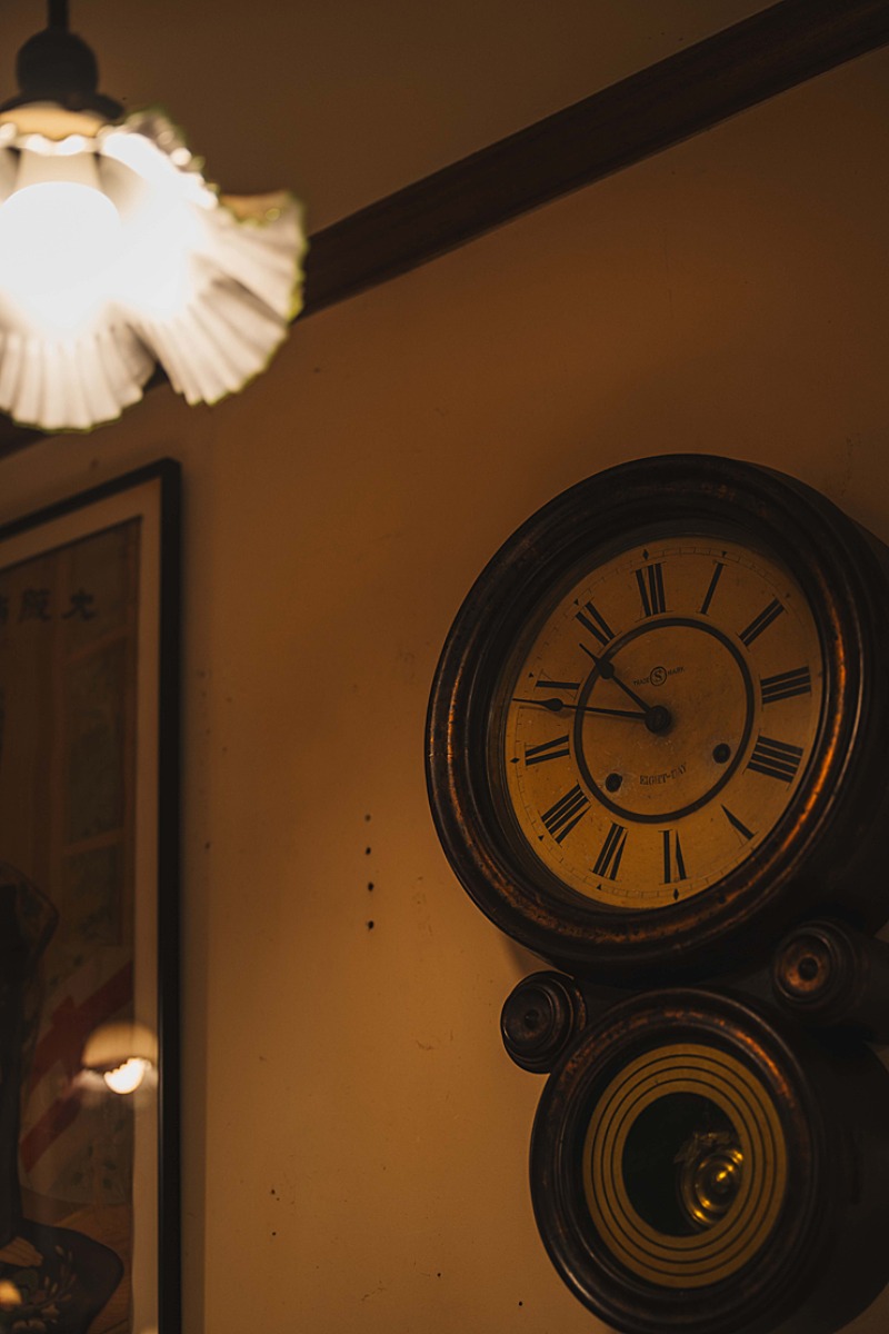 看板や電話機、時計など店主が趣味で集めたというコレクションが壁一面に並ぶ。